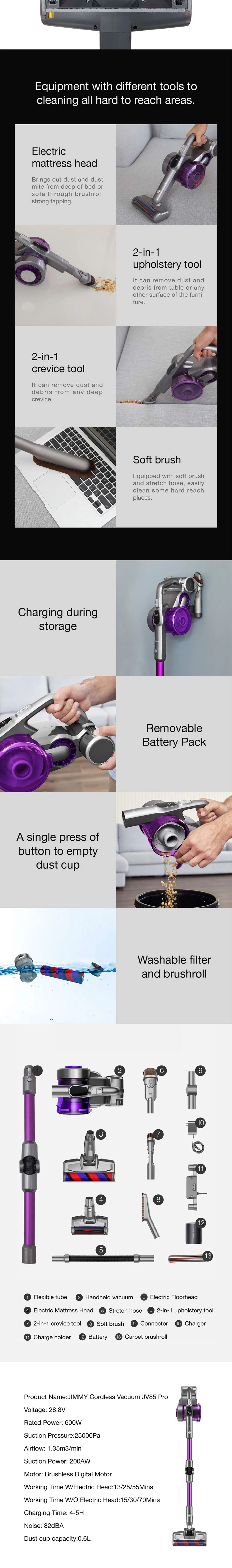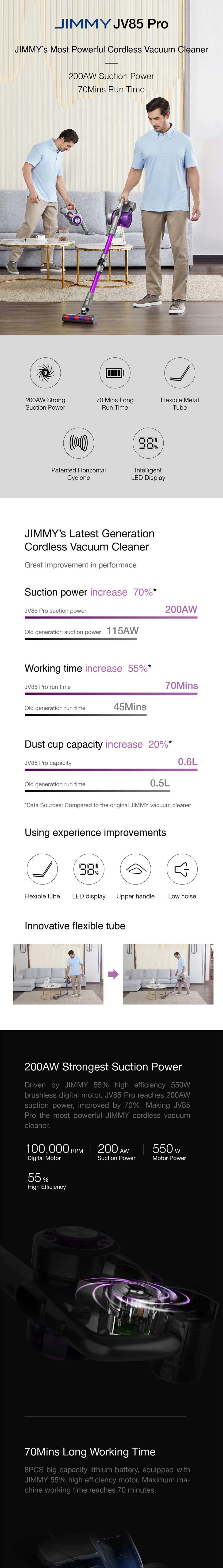 Управляемый Jimmy 55% высокая эффективность 550W Бесщеточный цифровой двигатель, JV85 Pro достигает 200AW мощность всасывания, улучшено на 70%. Создание JV85 Pro самого мощного беспроводного пылесоса.