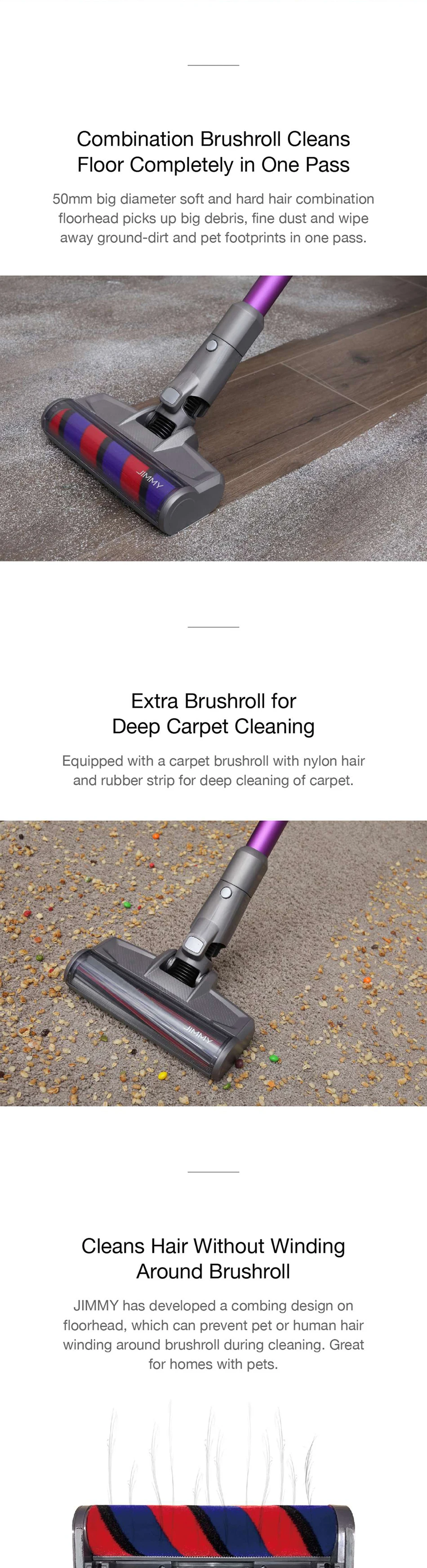 Jimmy разработала дизайн расчесывания на floorhead, который может предотвратить намотку домашних животных или человеческих волос вокруг кисти во время чистки. Отлично подходит для дома с домашними животными.