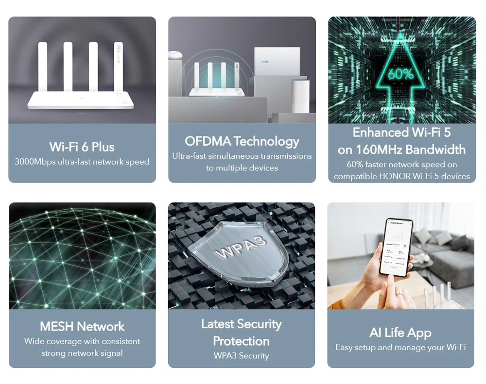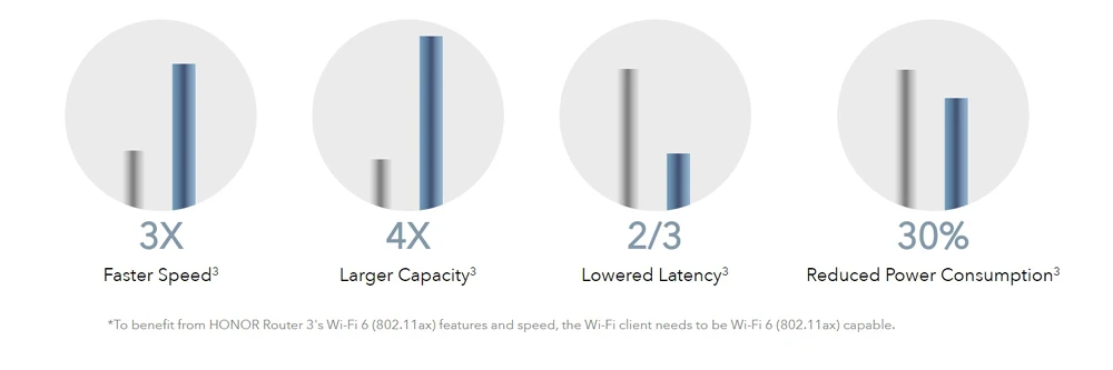 Более расширенная пропускная способность 160 МГц обеспечивает большую пропускную способность данных. Wi-Fi чипсет на HONOR маршрутизатор 3 и Wi-Fi 6 с поддержкой HONOR устройства была изменена для более быстрой скорости доходящие до 2,4 Гбит/с. Таким образом, если вы транслируете фильмы или загружаете файлы, вы получите их в кратчайшие сроки.