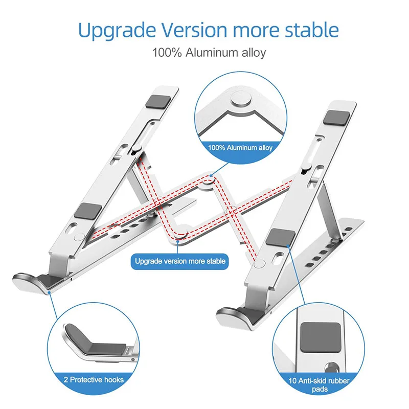 5. Структура продукта. Треугольная и двойная m-тип выдвижной структуры регулируемого держателя ноутбука предлагает кронштейн сильной поддержки. Он может выдерживать около 80 фунтов (40 кг). И противоскользящий силиконовый дизайн может предотвратить перемещение ноутбука во время использования.