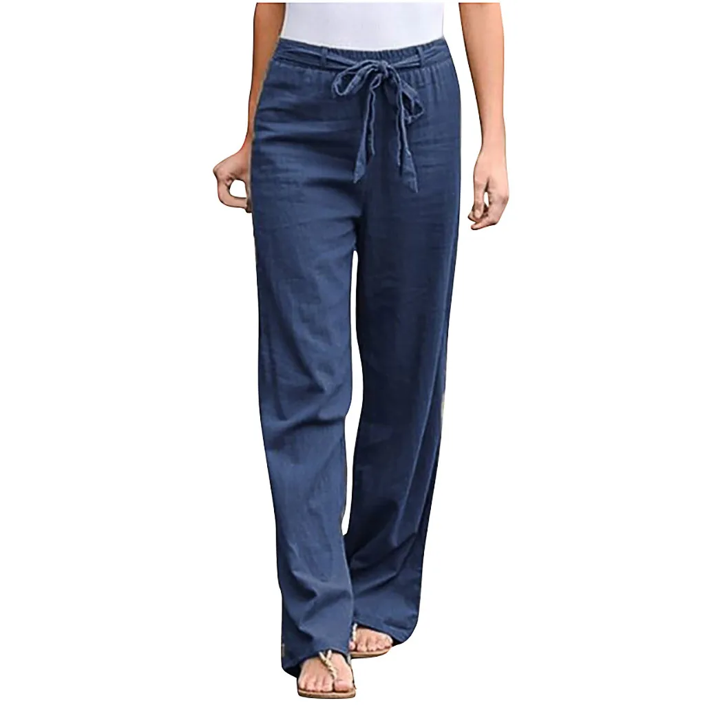 Модные Женские однотонные хлопковые льняные Прямые повседневные длинные брюки с поясом
