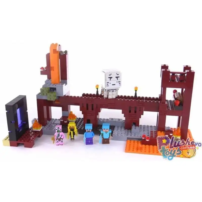 Из составляющих комплекта 10393 вы можете выстроить детализированную модель подземной крепости. Её стенки исполнены из Адского камня красного цвета. Слева заметен обсидиановый портал с функцией активации. Вблизи с ним размещена малая ниша с арочными проходами, над которыми зафиксированы 2 светящихся камня. Применяя алмазную кирку, их можно скучить и восполнить припасы священной светопыли, но бегая по стопам стоит остерегаться лавового водопада, готового обвалиться на головы неосмотрительных старателей.