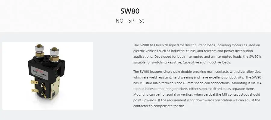 Серия контакторов SW80 была разработана для прямых нагрузок по току, особенно для двигателей, используемых на небольших электромобилях, таких как светильник, промышленные грузовики, работающие непригодные автомобили и т. Д.