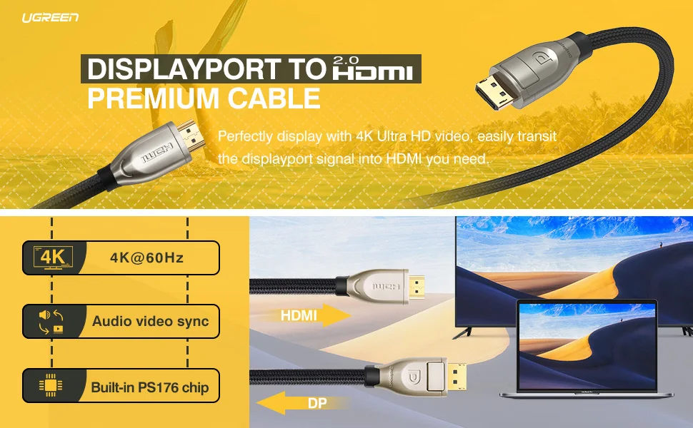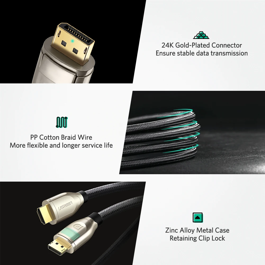 UGREEN Премиум Дисплей Порт-Male-HDMI-Male кабель позволяет подключать к DP устройств (e.g. ПК, ноутбук, или графических карт) к HDMI монитор, Дисплей, проектор, HDTV для видео и аудио передачи сигнала.