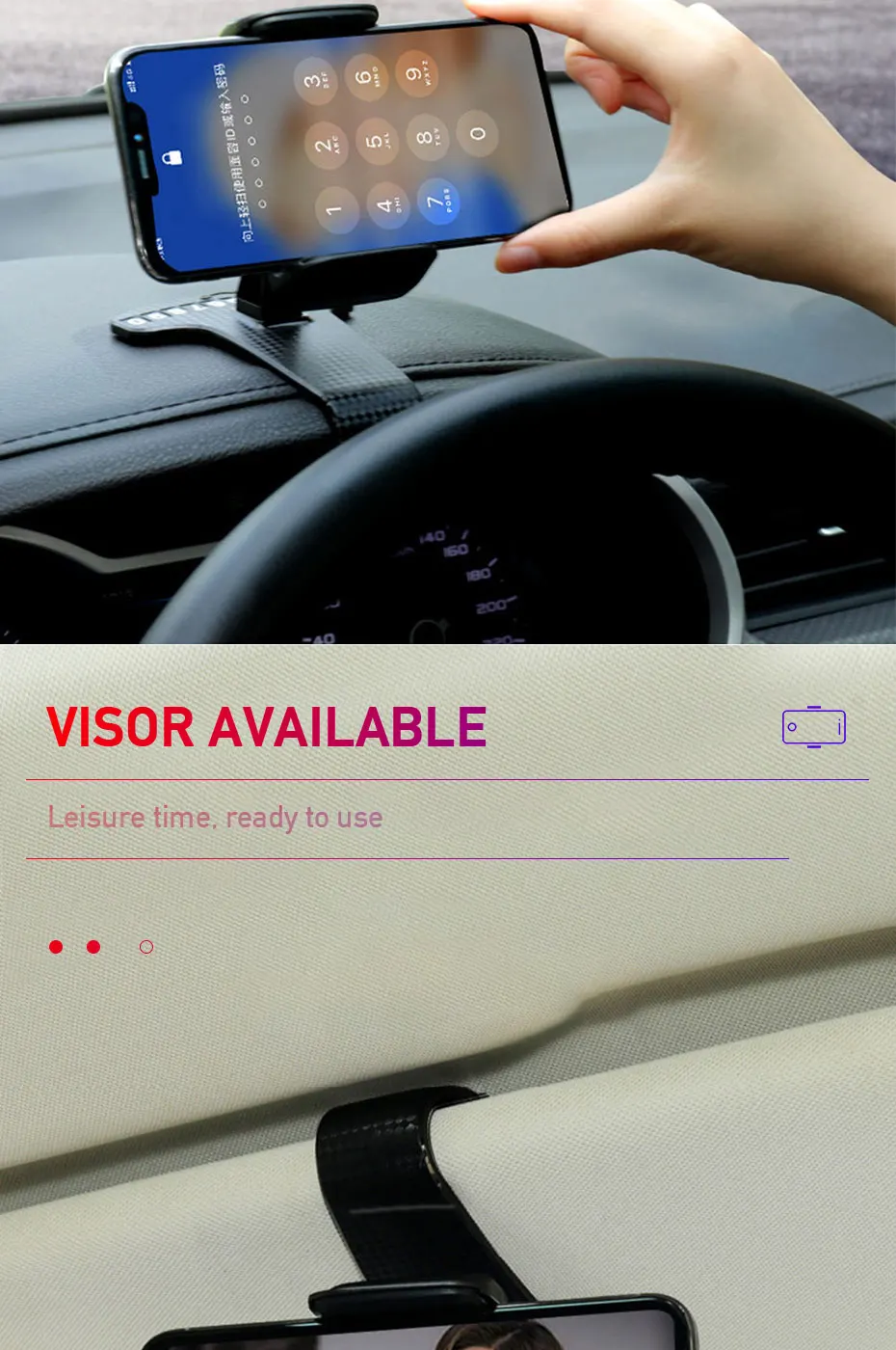 2. Держатель мобильного телефона принимает дизайн HUD имитирующий. Вам не нужно смотреть вниз на экран, просто будьте на уровне глаз, тогда вы можете получить лучший вид на дорогу, обеспечивая безопасное вождение во время вашего GPS или разговора, навигации, прослушивание музыки или зарядка.