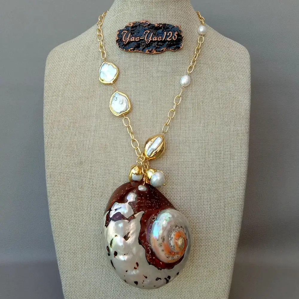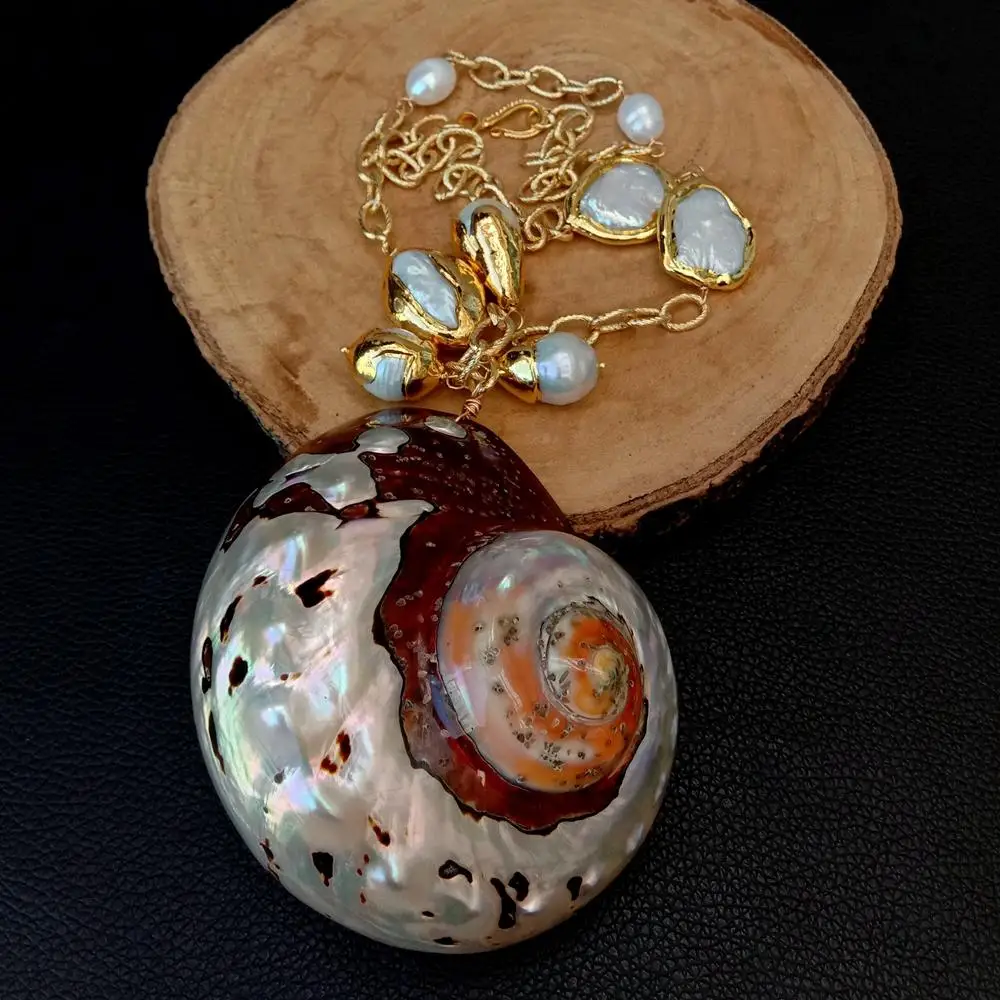 Информация о драгоценных камнях: пресная вода Культивированный жемчуг, белая модная жемчужина Кеши с покрытием из желтого золота 24 К, подвеска из натурального турбо-сарматика, хорошее качество, высокий блеск!