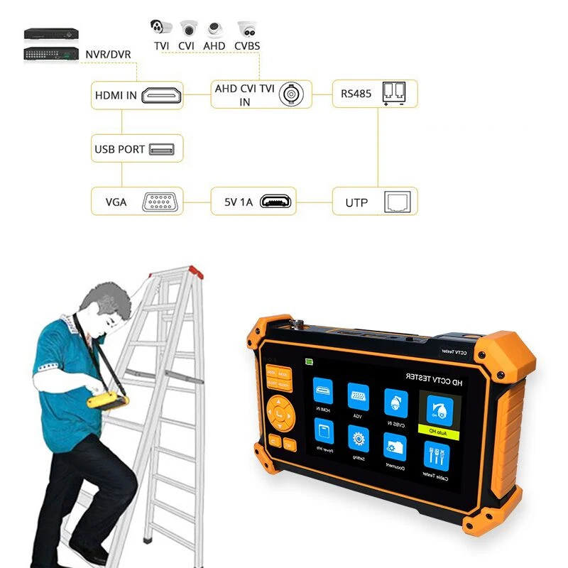 The CCTV tester is designed for the maintenance and installation of high-definition coaxial cameras, UTP cable testing and other safety equipment. 800 * 480 resolution makes it possible to display HD cameras and analog cameras with high resolution. CCTV installers usually need to carry various testing tools to complete the work. ●CCTV system installation and maintenance ●Installation and maintenance of network wiring projects ●TVI CVI AHD SDI camera test ●PTZ Controller
