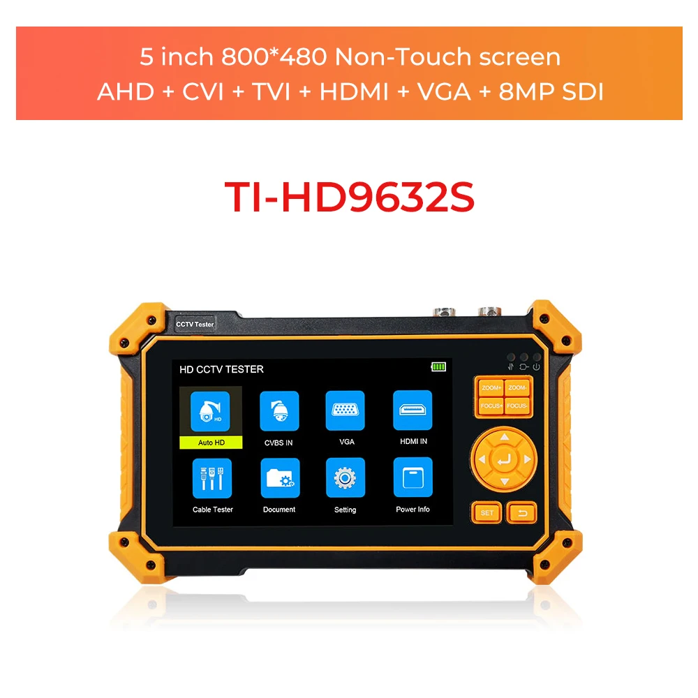 ● 5 inch TFT-LCD screen, 800*480 resolution ● 8MP TVI test, 3840 x 2160P 12.5/15 FPS, coaxial PTZ control & call OSD menu ● 8MP AHD test, 3840x2160P 15 FPS, coaxial PTZ & call OSD menu ● 8MP CVI test, 3840 x 2160P 12.5/15FPS, coaxial PTZ & call OSD menu ● 8MP EX-SDI test, 3840 x 2160P 25/30FPS, coaxial PTZ & call OSD menu* ● HD-SDI test, 1920 x 1080P 25/30/50/60 FPS, coaxial PTZ & call OSD menu* ● 3G-SDI test, 1920 x 1080P 50/60 FPS, coaxial PTZ & call OSD menu* ● Auto HD app, auto recognizes HD coax camera type and resolution, support coaxial PTZ & call OSD menu ● VGA input, up to 1920 x 1200P 60FPS, test and debug DVR/XVR ● HDMI Input, up to 4K 30FPS, test and debug DVR/XVR ● Analog camera test, PTZ controller ● DC12V/1A power output, camera can be powered from DC 12 Voltage ● DC 5V 1A power output, support reading USB disk