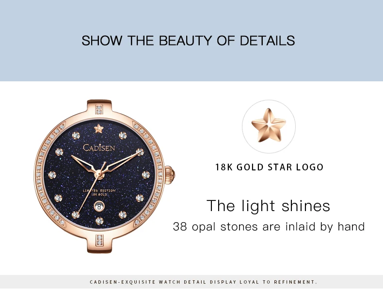 Кадисен 18K золотые кварцевые часы Описание: -100% новый и высокое качество. -Великолепный дизайн, голубой песчаник + золото 18K (звезда). -Японский кварцевый механизм MIYOTA. Для точного хранения времени. -Чехол из нержавеющей стали 316L и ремешок для часов из нержавеющей стали. Характеристики (прибл.): -Диаметр корпуса часов: около 3,0 см -Толщина корпуса часов: около 0,7 см -Длина ремешка (включая чехол): около 20 см -Ширина ремешка: около 1,3 см Посылка включает в себя: -Новые часы One CADSIEN -Одна коробка. -Руководство по эксплуатации, гарантийный талон. -Одна тканевая салфетка для чистки часов