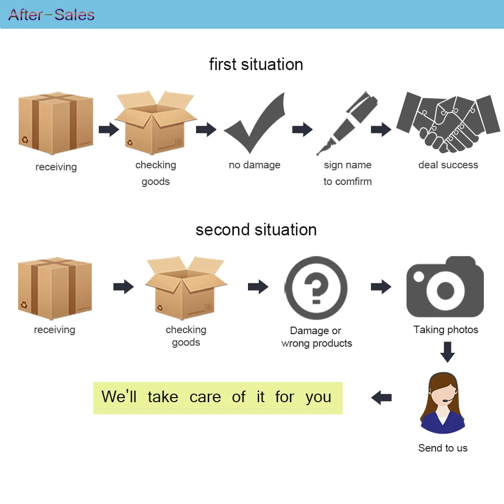 Первая ситуация: получение-проверка товаров-отсутствие повреждений-имя знака для подтверждения-Успех сделки. Вторая ситуация: получение-проверка товаров-повреждения или неправильные продукты-фотографирование-свяжитесь с нами.