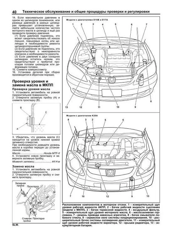 Подробно рассмотрены процедуры проверки, регулировки и обслуживания АКПП, вариатора (CVT) и систем ABS (антиблокировочной системы тормозов), EPS, VTEC и VTC. Представлены подробные электросхемы и описания проверок электрооборудования моделей различных вариантов комплектации.
