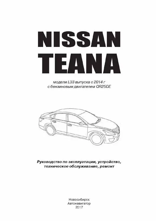 Этот японский автомобиль удобен и надежен со всех сторон, независимо от того, в каких именно условиях он используется, будь то длительные путешествия по трудным дорогам или аккуратные деловые поездки. Ниссан Теана третьего поколения отличается особенно элегантным и запоминающимся дизайном, машина удобна в управлении, имеет богатую базовую комплектацию (при доступной стоимости), высокий уровень безопасности. Если вы уже являетесь владельцем данной машины или только приглядываетесь к этой модели Ниссан (основной конкурент которой – Тойота Camry), то вам непременно понадобится профессиональная книга для мастеров и автовладельцев, руководство по ремонту NISSAN TEANA L33. Справочник поможет правильно справиться с возможными затруднениями в процессе вождения, подскажет, как грамотно обслуживать и ремонтировать технику, даст полезный совет в зависимости от конкретной ситуации. В предлагаемом мануале собрана исчерпывающая информация по Ниссан Теана третьего поколения (выпускается с 2014 года). Эти автомобили оснащаются бензиновыми силовыми агрегатами QR25DE рабочим объемом 2.5 литра.