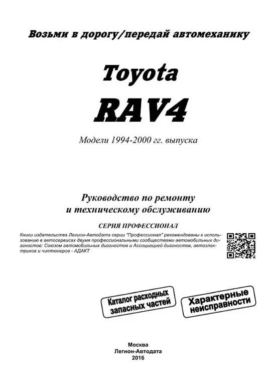 Поскольку первый тираж технического справочника об этих популярных кроссоверах, был быстро разобран, возникла необходимость в новом издании. Теперь его смогут купить все желающие, включая тех, кто не успел в предыдущий раз. Качественное руководство по ремонту Toyota RAV4 включает в себя всю информацию по устройству и техобслуживанию, использованию и починке джипов первого поколения, выпускавшихся в период с 1994 по 2000 годы. Эти модели оснащались бензиновым мотором с распределенным впрыском топлива 3S-FE (объемом 2,0 литра). В книге рассматриваются джипы, оборудованные левосторонним либо правосторонним рулевым управлением, уделено также внимание моделям Тойоты. рассчитанным на американский рынок. Мануал выпущен издательством «Легион-Автодата», что уже само по себе является гарантией хорошего качества и профессионализма книги, ведь издатели сотрудничают только со специалистами в области автомеханики, которые имеют большой опыт и знают, какие именно вопросы необходимо осветить в первую очередь для читателей с различным уровнем знаний и умений. К тому же руководство по ремонту Тойота РАВ 4 хорошо оформлено, все схемы и рисунки – а их в книге великое множество – прекрасного качества, отпечатаны четко, на белой бумаге. Содержание выстроено логично и удобно для использования, так что все рекомендации авторов можно применять на практике.