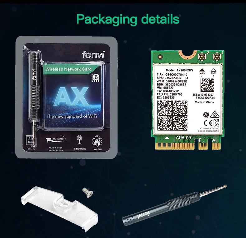 Модель: AX201NGW Двухдиапазонный: 2,4 ГГц/5 ГГц (160 МГц) Скорость до 2,4 Гбит/с (маршрутизатор должен на 160 МГц, 802.11ax); Скорость 2,4 Гбит/с по Wi-Fi 5 ГГц (160 МГц) и вокруг 574 МБ/с. с использованием 2,4 ГГц (802.11ax в обоих случаях). С Bluetooth 5,0, поддержка MU-MIMO Интерфейс: M.2, CNVio2, 22*30 мм Поддерживаемые операционные системы: работает только на Microsoft Windows 10*64 бит, Примечание: не поддерживает Windows 7/8/8.1 Модуль поддерживает MU-MIMO, 2x2 канала TX/RX с двумя антеннами и Bluetooth 5,0