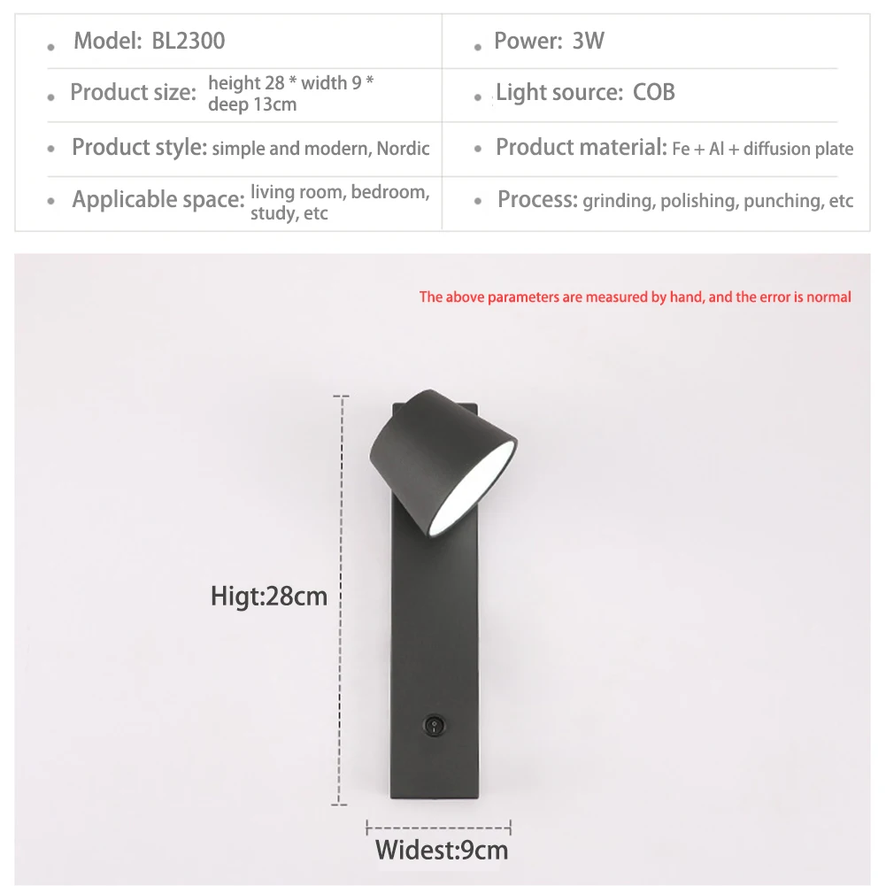 Features: No disturbance: if you read in the evening, you will not disturb your partner, warm white reading lights will allow you to always feel relaxed and comfortable. Flexible reading light: 360 degree rotation lights, easy to move to the desired lighting position and angle, as bedside lamp it can be easily moved to the desired position. Easy to install: Drill two holes in the wall, then secure the stand firmly to the wall. There is a switch button on the control panel, no extra cables. Good heat dissipation: We use an aluminum material as a heat sink, which can extend the life of the lamp. Vision Protection: Dedicated lens and LED provide bright focused illumination without glare and flashing. Specification: Material: iron + aluminum Item color: black Light color: cold white 5800-6200K,warm white 2800-3200K Light source: COB Power: 3W Size: 9cm x 28cm x 13cm Weight: 800g Package includes: 1 x LED Wall Light