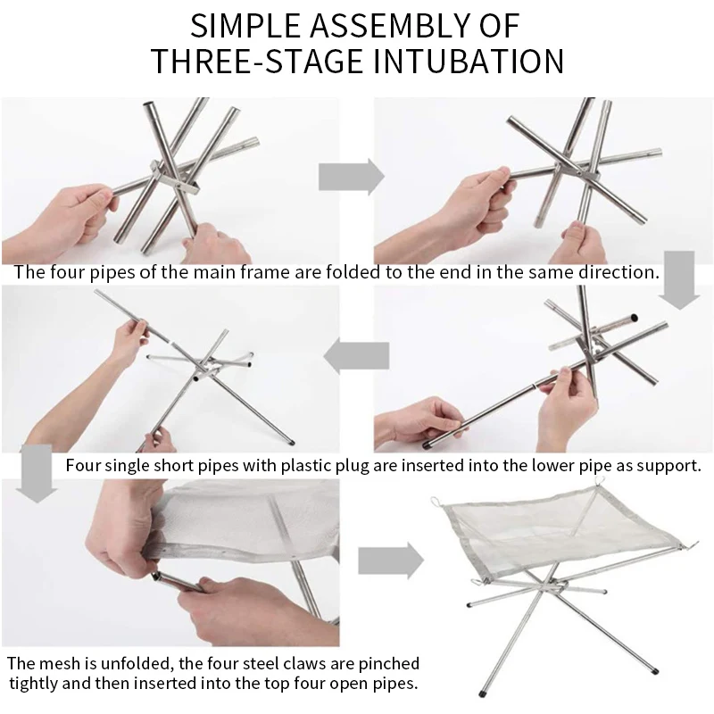 <Удобный в использовании: портативная пожарная яма обеспечивает полный опыт работы с пожарным, обеспечивая портативность и качество. Идеальный аксессуар для любого патио или похода в поход, отлично подходит для отдыха на природе. <Компактный и легкий: Эта портативная пожарная яма оснащена откатной сеткой из нержавеющей стали и складными ножками, а чехол для переноски входит в комплект для удобного хранения. <Широко используется: идеально подходит для кемпинга, пикников и других приключений на открытом воздухе. <Прочный: Эта пожарная яма имеет возможность держать достаточно древесины для пожаров всех размеров. Сетчатая сетка изготовлена из экологически чистой нержавеющей стали 304 и анти-нагревательного материала. Тонкая плетеная стальная сетка ограничивает золу и мусор от проскальзывания, что облегчает очистку. <Простота установки: никаких инструментов не требуется, что позволяет легко собрать и разобрать.