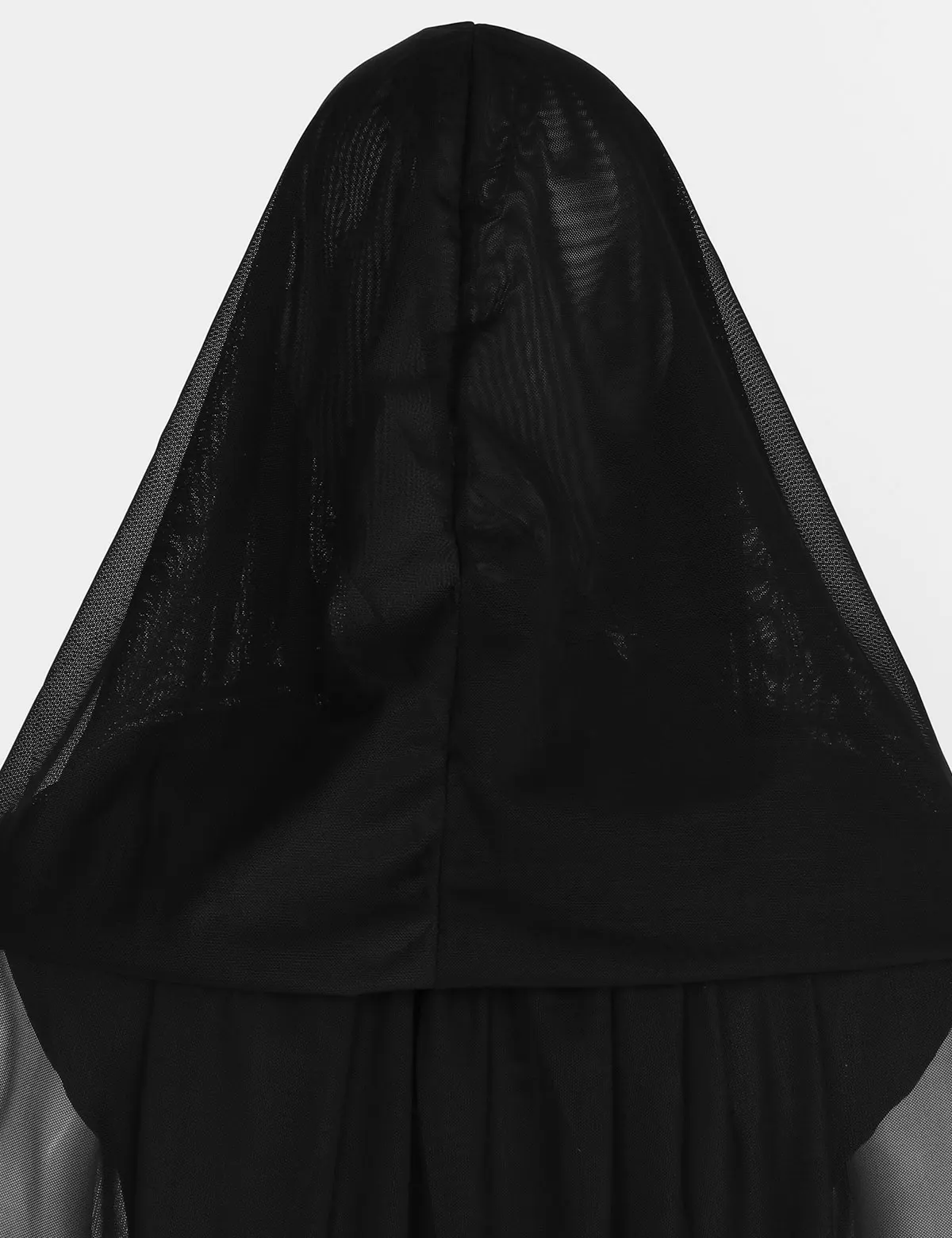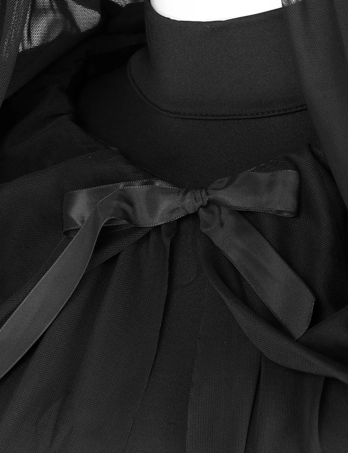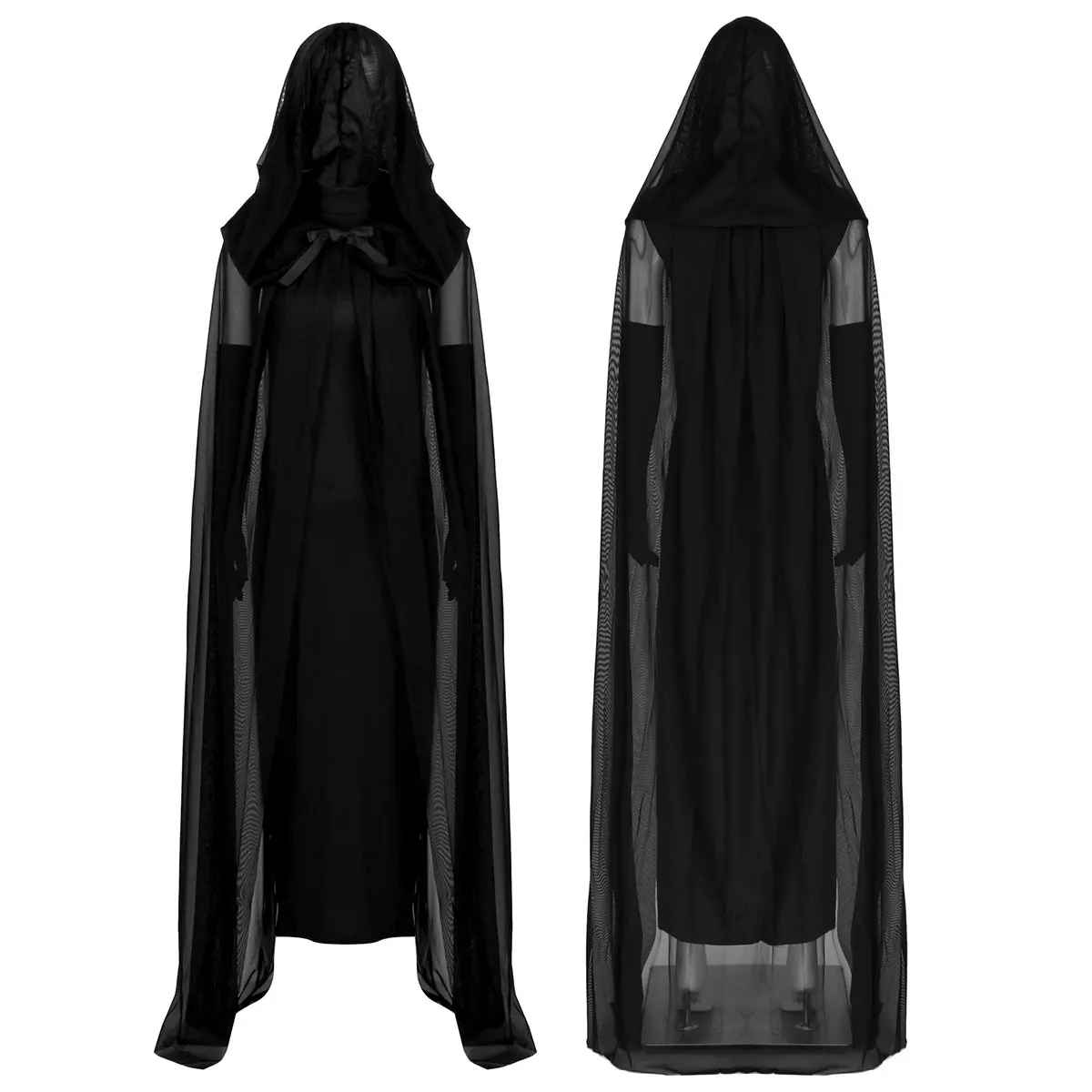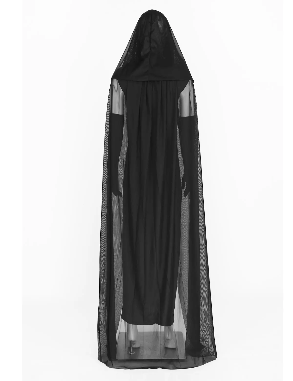 High neck and sleeveless long dress, single layer and slim fit. Pair a long mesh hooded cape with satin ribbons to secure at neckline.