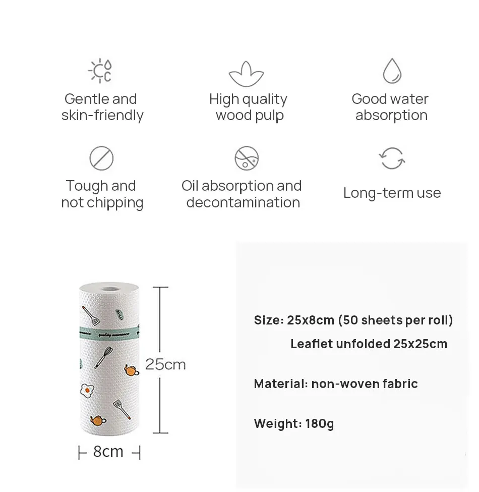 1. Материал: 100% растительное волокно, Нетканая ткань 2. Спецификация: 9,84X9,84 дюйма/25X25 см на лист, 50 листов в рулоне 3. Безопасно и гигиенично 4. Конструкция точки останова 5. Сухое и влажное использование 6. Сильное поглощение воды и масла 7. Нелегко оторвать 8. Антипригарный и без остатка 9. Легко чистить 10. Многоцелевой 11. Возможность повторного использования