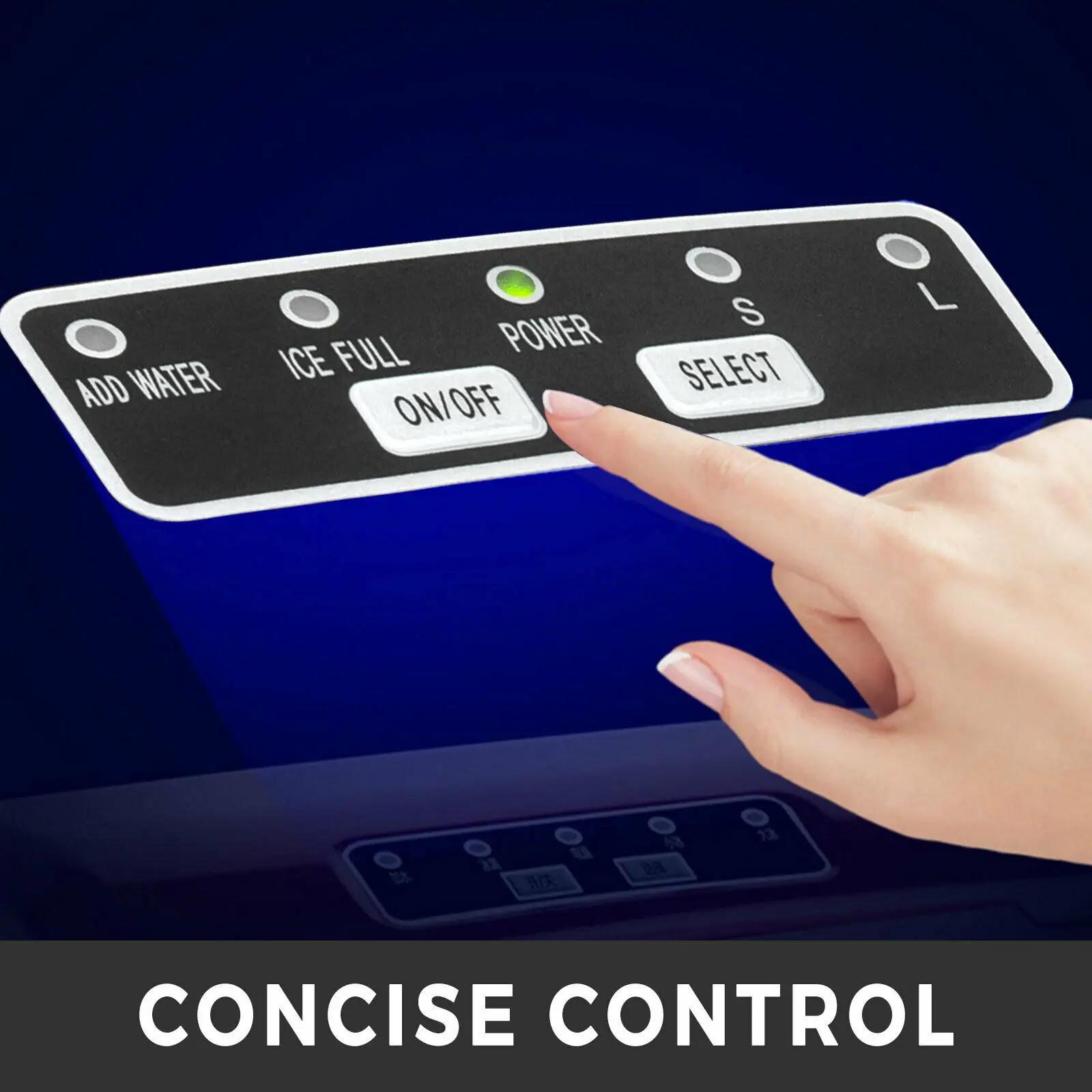 Concise Control Simple control button ON/OFF and SELECT with LED indicator lights, making operation status clear at a glance. Alerts are made when water is low and ice bin is full. Power and ice size are also indicated.