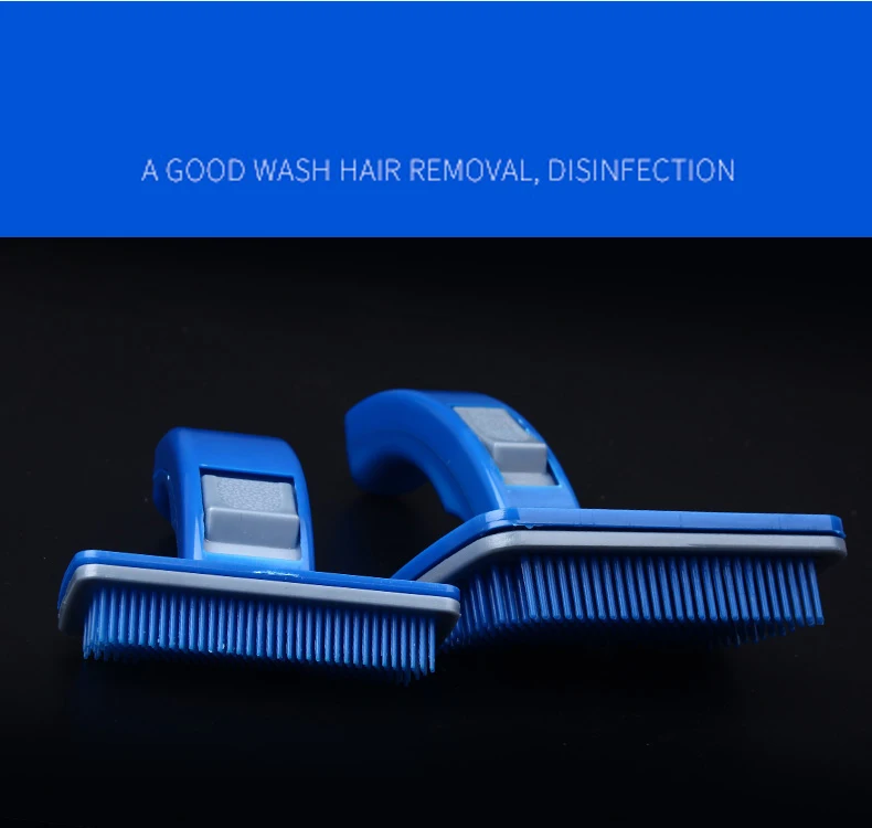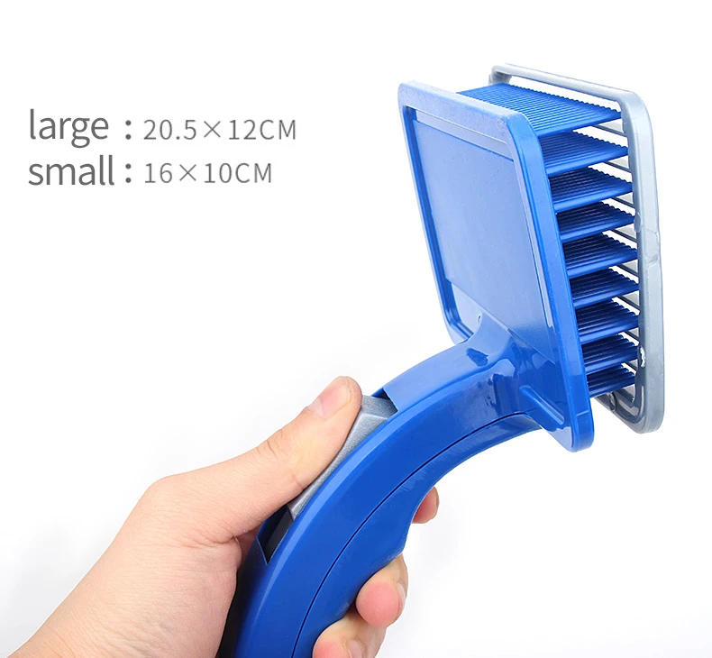 Название продукта: щетка для удаления волос для домашних животных Размер продукта: маленький размер: гребень поверхность 10*5,0 см длина иглы 2,0 cm длина ручки 10 см общая длина около 16 см Большой размер: гребень поверхность 12*7,5 см, длина иглы 2,8 см, хорошо фиксирующую ногу длиной 12,5 см, общая длина около 20,5 см Цвет продукта: синий Вес: 85 г для маленьких 135 г для больших размеров