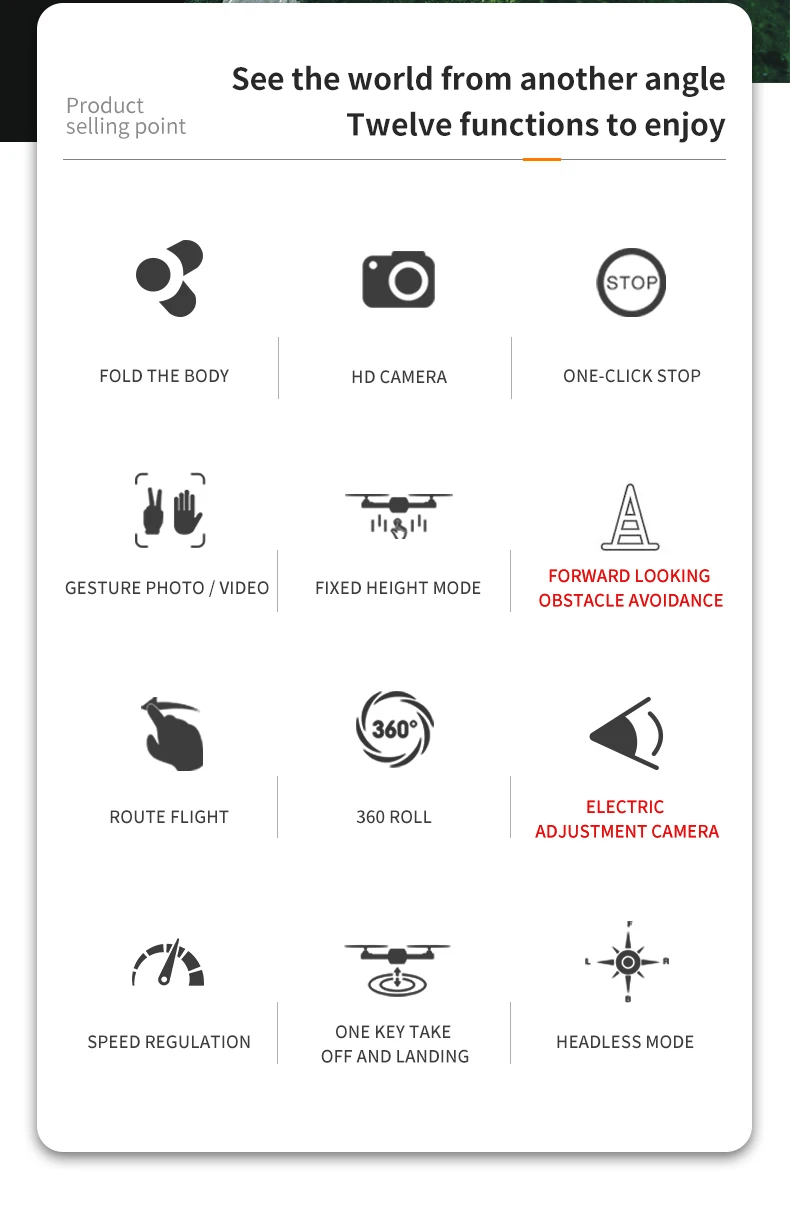 1. Функция предотвращения препятствий переднего видения. 2. Электрическая регулировка камеры, регулировка на 90 ° 3. Модульная батарея + камера. 4. Поддерживает изображения жестов, видео. 5. Оптическая версия потока добавляет двойной переключатель камеры, оптическая регулировка высоты