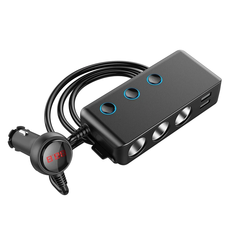 Технология Smart IC позволяет быстро распределить скорость зарядки. Светодиодный дисплей помогает контролировать напряжение автомобильного аккумулятора. В тех случаях, когда напряжение находится под 10,5 ± 0,4 V, светодиодный дисплей начнёт flashing.3 отдельные переключатели добавлены для того чтобы контролировать каждый гнездо прикуривателя.