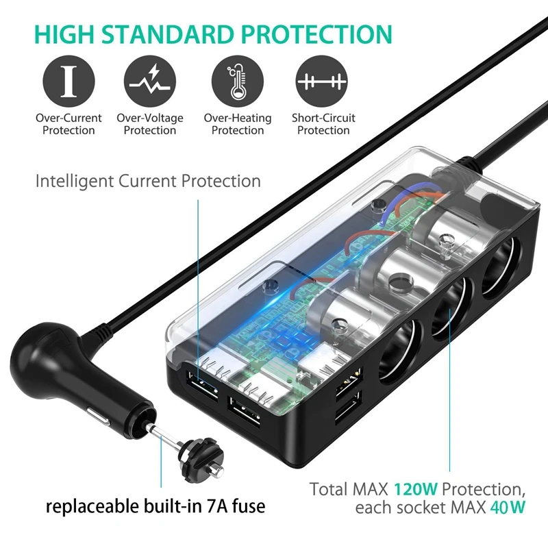 Адаптер прикуривателя имеет встроенный предохранитель 7A для защиты ваших устройств от перенапряжения, перегрева, перегрузки или короткого замыкания.