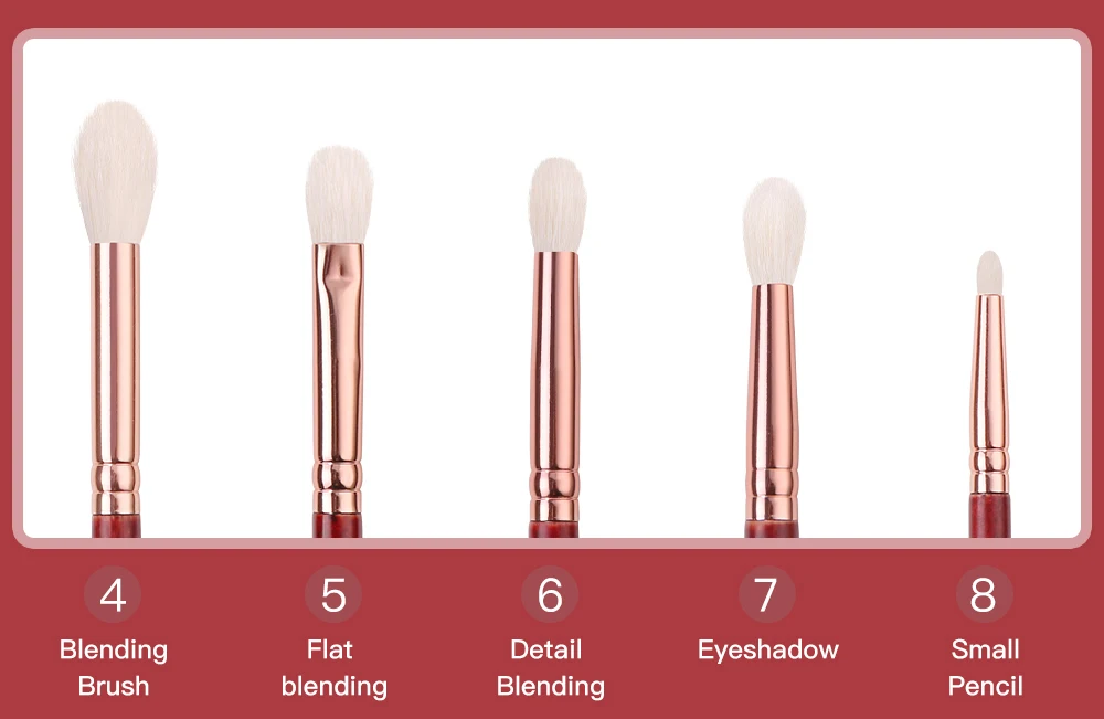 4. Кисть для растушевки 2 см/17,5 см 5. Плоская кисть для растушевки 1,5 см/17,5 см 6. Деталь смешивания 1,5 см/17 см 7. Кисть для нанесения теней 1,7 см/16,7 см 8. Маленький Карандаш 0,5 см/15 см (4/5/6/7/8/козья шерсть)