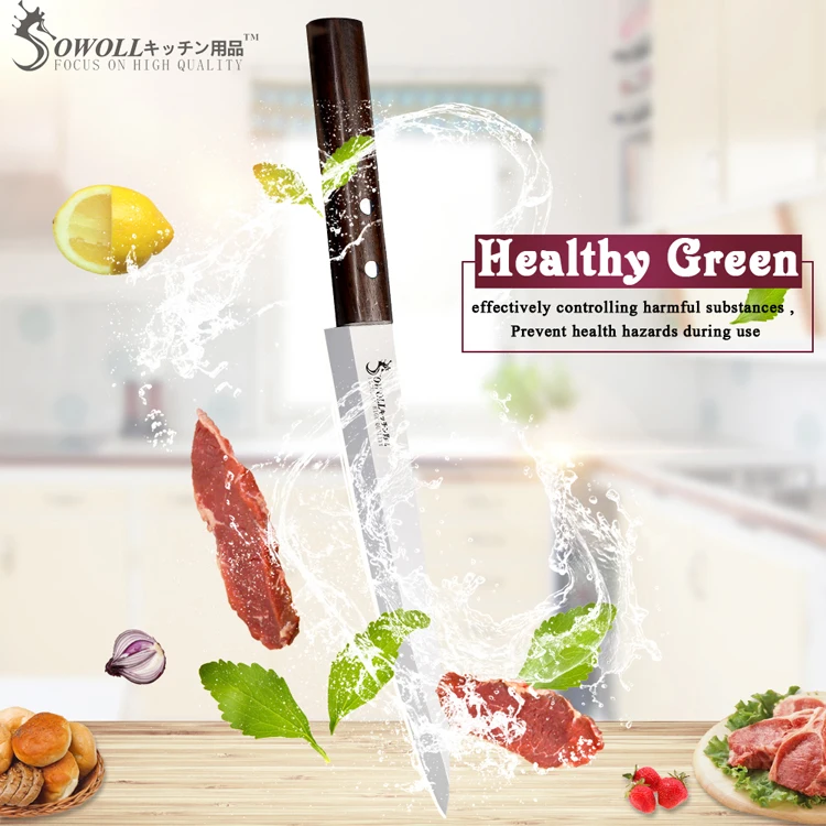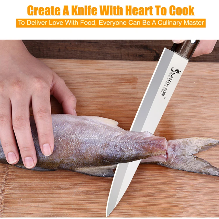 Характеристики: Твердость: 60-62 HRC Ремесло: бесшовная сварка Материал лезвия ножа: нержавеющая сталь высокого качества 4CR14 Материал ручки ножа: ручка Monzo Особенности: Нож из нержавеющей стали производится профессиональными работниками с богатым промышленным опытом, принятым интегрированным дизайном. Использование высококачественных материалов производства, прочный, соответствует эргономичному дизайну, не ржавеет, хорошее качество, легко режется, более длительный срок службы. Посылка включает в себя: 1*8 дюймов сашими нож