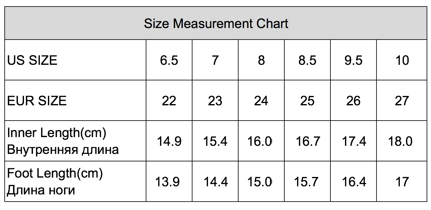 Пожалуйста, проверьте таблицу размеров ниже. Пожалуйста, выберите свой размер в соответствии с длиной стопы. Как только вы найдете нужную длину стопы, найдите соответствующий американский/Европейский размер для размещения заказа.