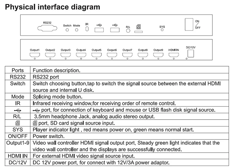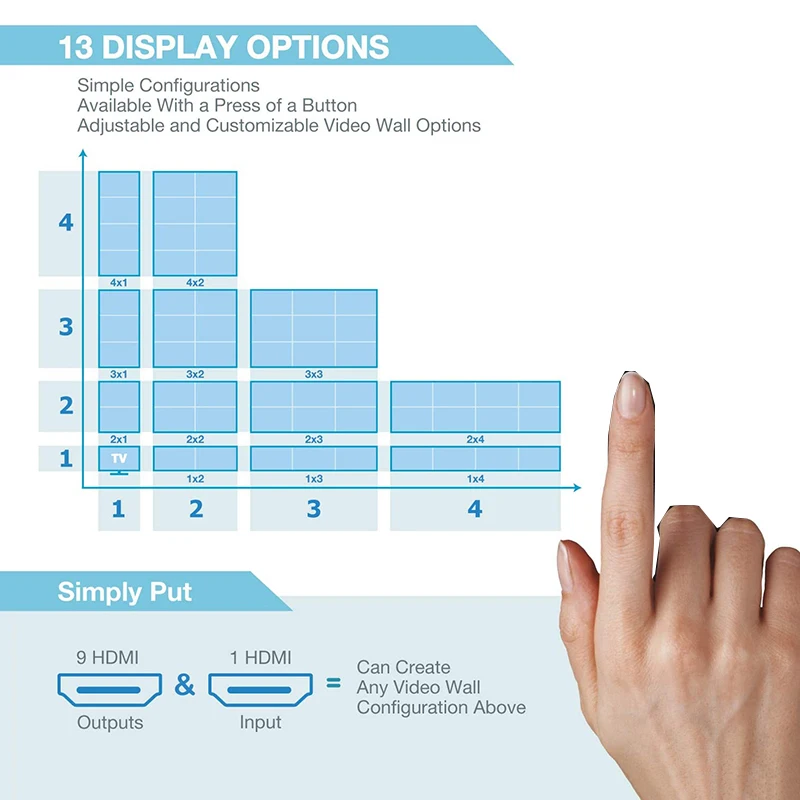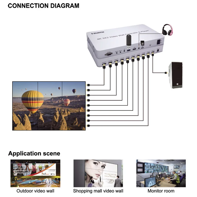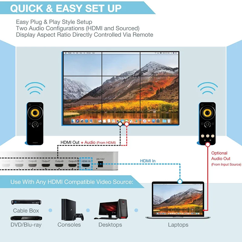 🌟Поддержка 9-канальный: распределяет одно Входное устройство HDMI (компьютер, ноутбук, dvd-плеер, консоль и т. д.) на 9 экранах одновременно. Plug & Play: драйвер не нужен. 🌟Поддержка 13 режимов отображения-1x2, 1x3, 1x4, 2x1, 2x2, 2x3, 2x4, 3x1, 3x2, 3x3, 4x1, 4x2 обеспечивают дополнительные различия на дисплее. Передача сигнала HDMI до 100 футов без потери качества изображения 🌟Поддерживает девять выходов HDMI; 🌟Поддержка 8 10 12 глубины цвета 🌟Поддержка воспроизведения u-диска 🌟Поддержка инфракрасного управления 🌟Поддерживаемые аудио форматы-PCM 2,0, 🌟Бесплатная техническая поддержка.