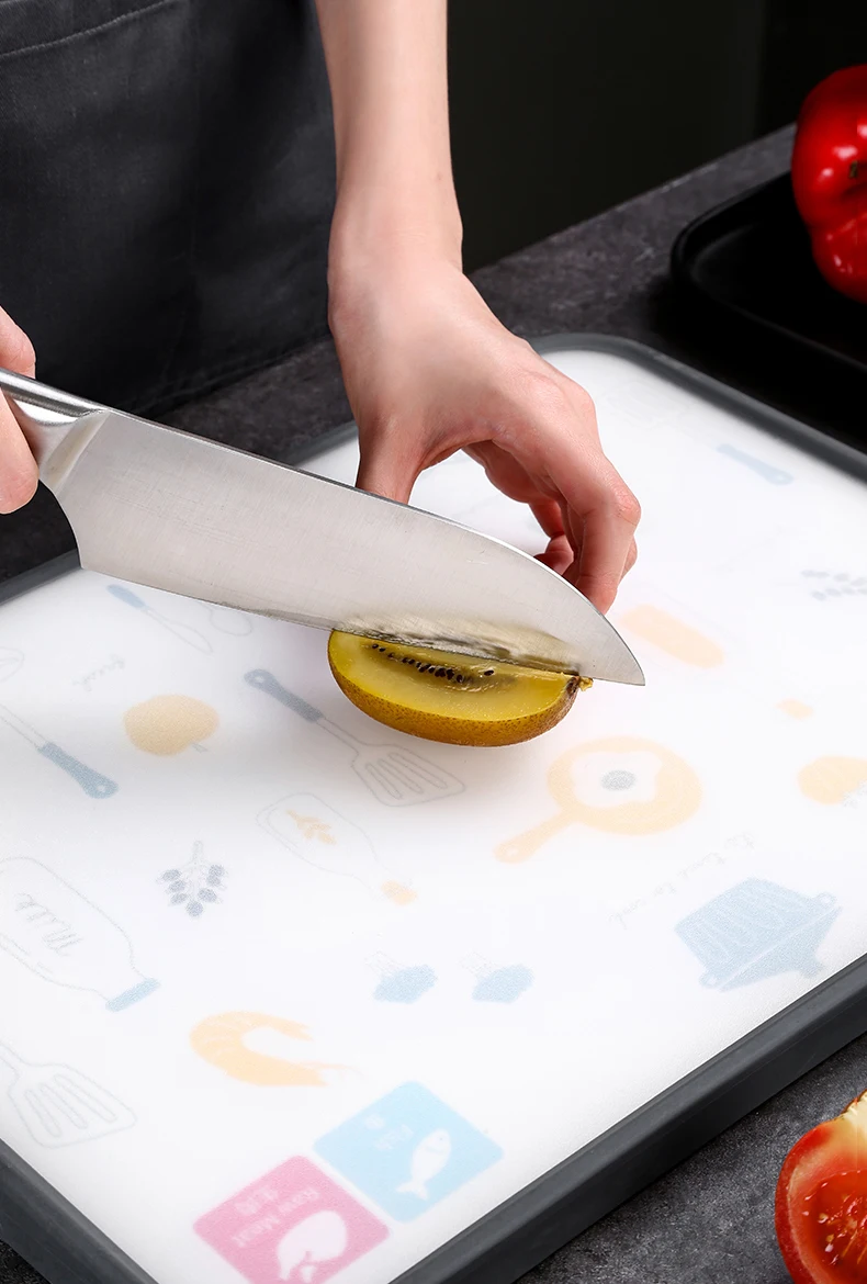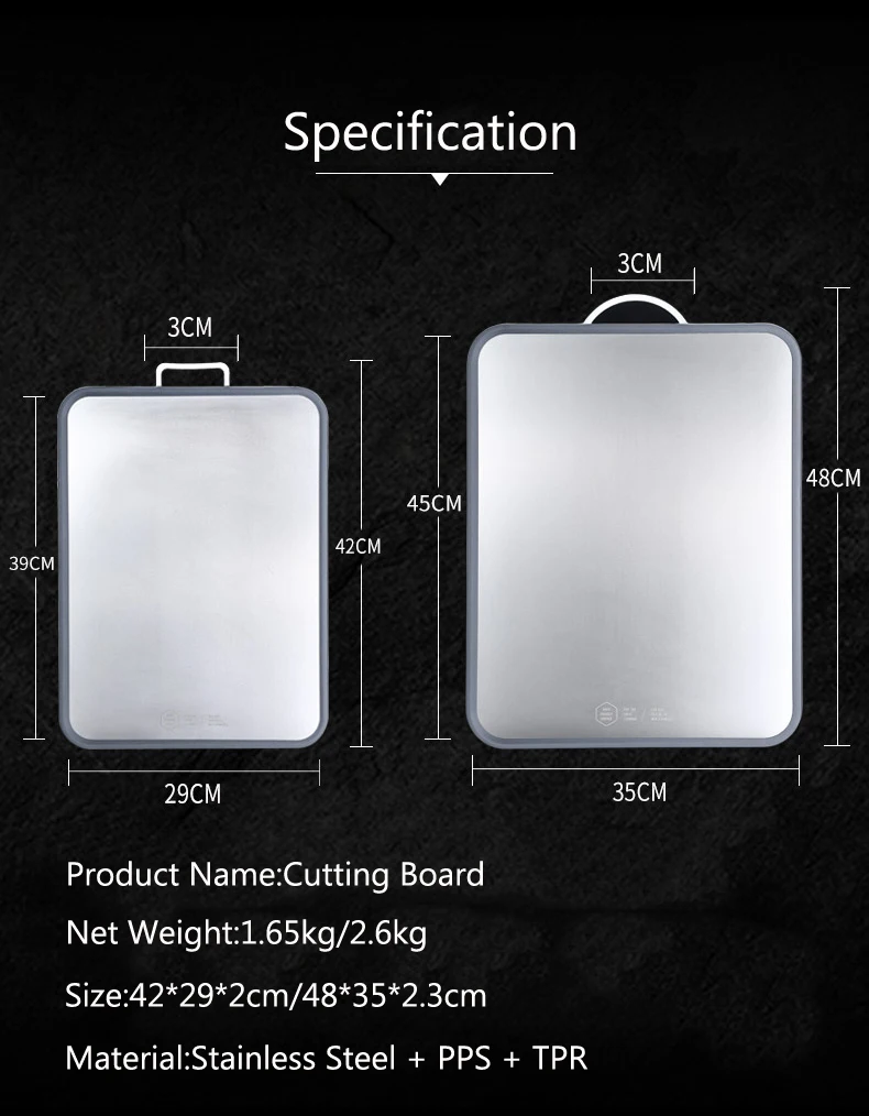 Водонепроницаемость и защита от солнца: Наши разделочные доски погружены в воду без проблем. В отличие от изредка забытой деревянной разделочной доски, она естественным образом изгибается и трещины при замачивании в воде. Порезостойкая: изготовлена из нержавеющей стали, одна сторона разделочной доски изготовлена из нержавеющей стали 304. Часто ли вы режете овощи, продукты питания или куриные ножки, никаких заметных изменений и все еще ярких. Подходит для длительного хранения и резки всех видов продуктов питания, продуктов питания со сталью. Здоровье, безопасность и охрана окружающей среды: разделочная доска не имеет специфического запаха, не будет заплесневелой и более здоровой. Другая сторона-это пластиковый материал. Безвкусный, чистый, зеленый. Легко чистить: материал с обеих сторон не липкий, вы можете использовать краску в воде, чтобы сохранить ее в чистоте. Согласно нашим последним экспериментальным данным, ее нельзя мыть в посудомоечной машине Легко хранить: есть портативная часть на разделочной доске для удобной переноски и подвешивания.