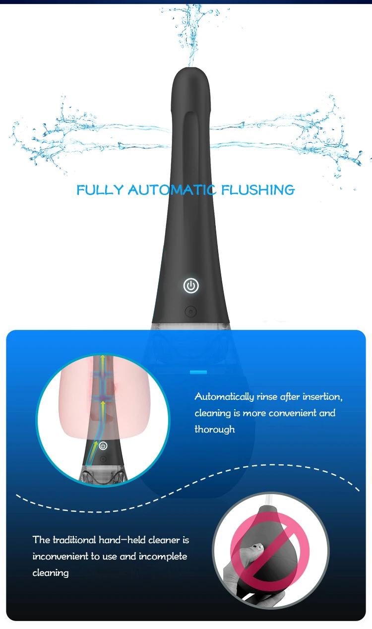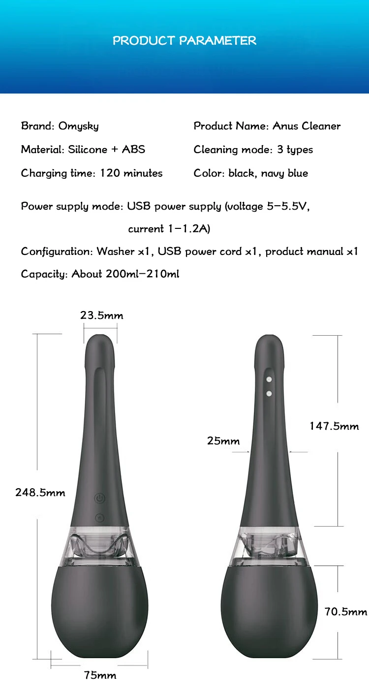 Основной материал: силикон + ABS Тип управления: электрический Максимальный шум: 60 дБ Вес изделия (включая упаковку): 260 г Размер упаковки товара (см) около 16,5*9,2*31,6 см Комплектующие для упаковки: кабель для зарядки, сертификат, инструкция Подходящие люди: Люди старше 18 лет Функция и использование: полностью автоматический перезаряжаемый душ для влагалища и ануса, дизайн anti-reflux Время зарядки: около 2 часов Время использования: около 2 часов Состояние зарядки: мигающий светильник Полное Состояние: горит синий светильник
