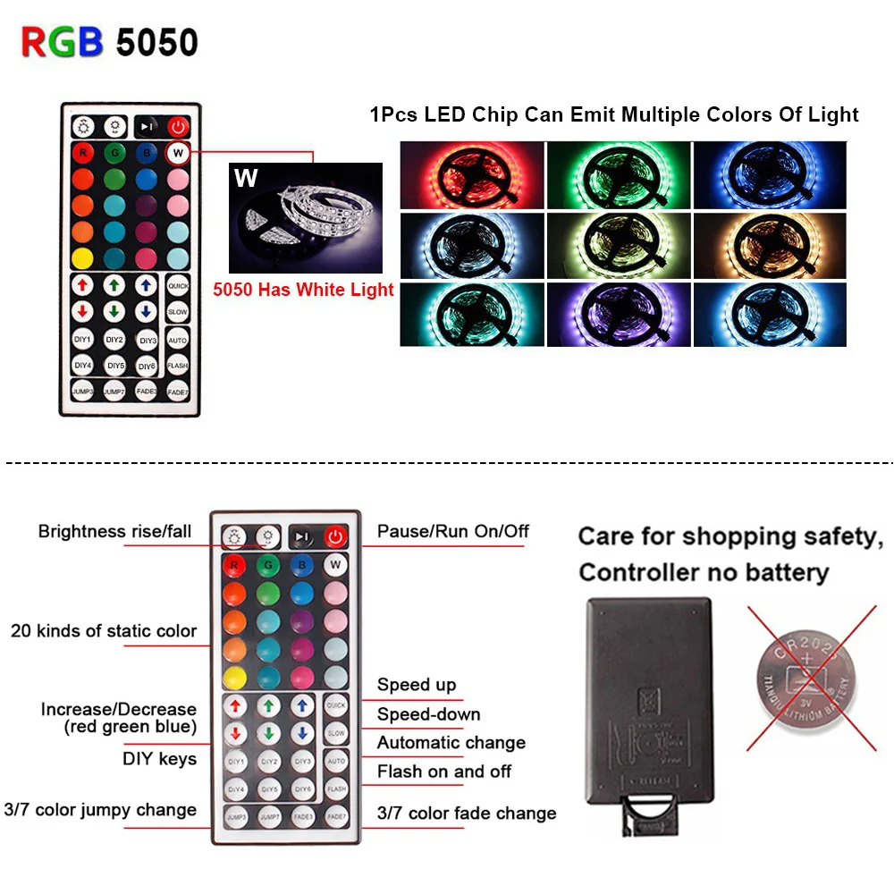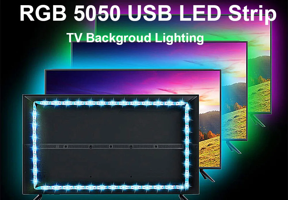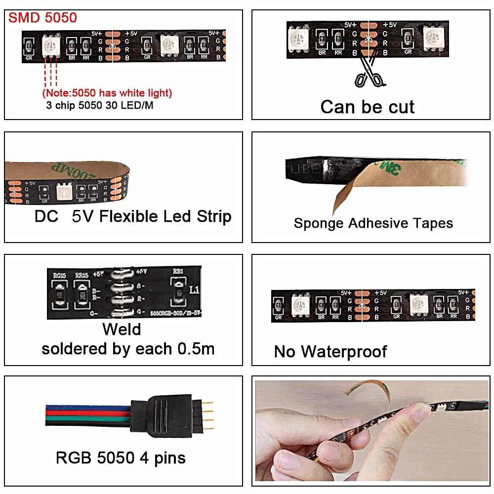 -Светодиодный Тип: SMD 5050 -Не водонепроницаемый -Цвет излучения: Светодиодная лента 5050 RGB (с белсветильник) 1 светодиодный чип может излучать несколько цветов светильник -Длина ленты: 1 м/2 м/3 м -Количество СВЕТОДИОДНЫЙ Дов: 30 светодисветодиодный/метр -Напряжение: 5 В постоянного тока (источник питания USB) -Эту светодиодную ленту можно использовать на любых устройствах с USB 5 В (2 а/3 а) -Вариант контроллера: 1. Мини-контроллер с 3 кнопками на проводе 2. ИК-пульт дистанционного управления с 44 клавишами 3. Контроллер приложения Bluetooth