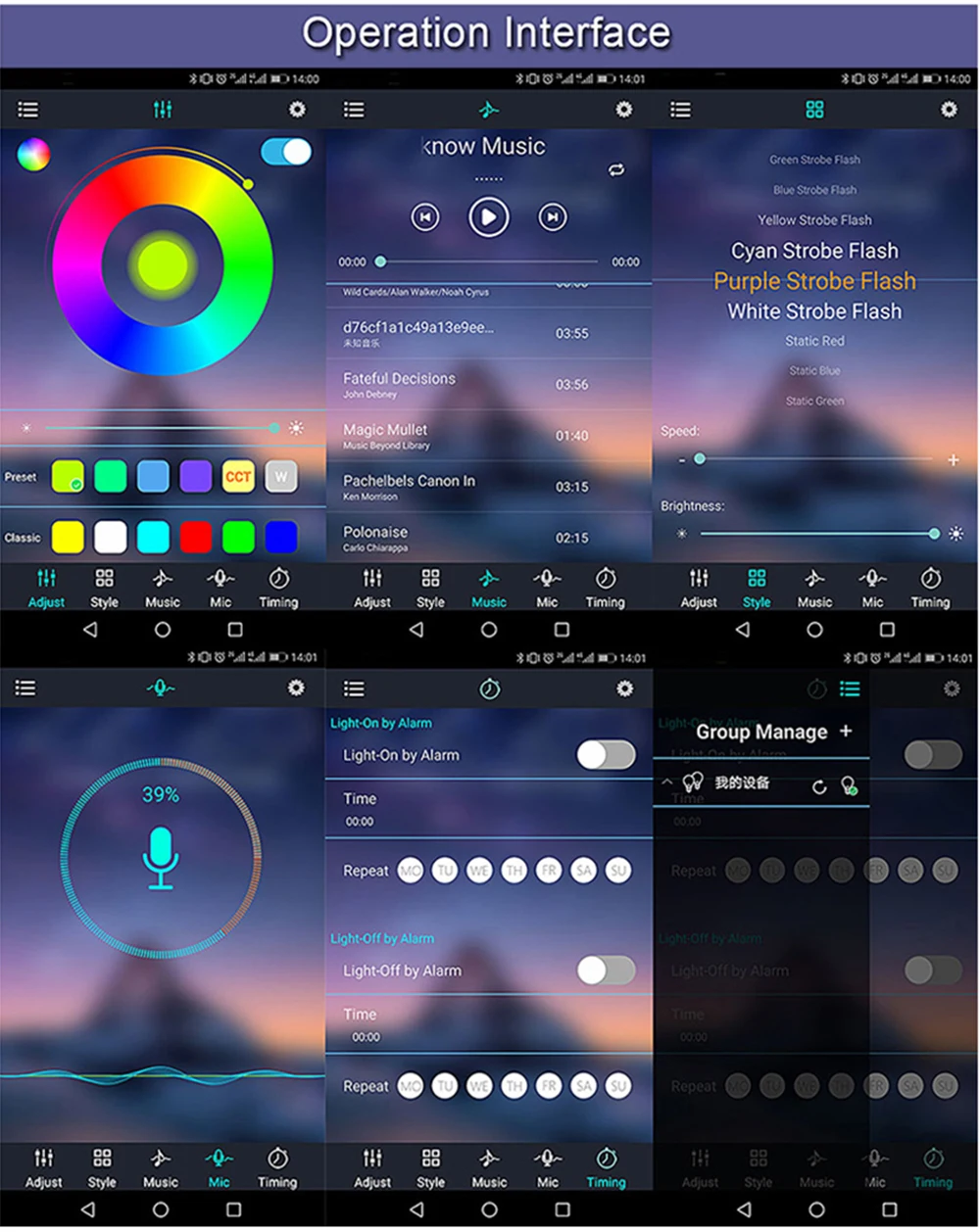 1. Откройте соединение по Bluetooth через 2. Откройте приложение led, и приложение автоматически подключится светильник Нику. 3. Регулировка: изменение цвета светодиода RGB 4. Музыка: воспроизведение музыки и изменение цвета светодиода RGB в соответствии с музыкальным ритмом 5. Узоры: изменение цвета светодиода RGB на фиксированной модели 6. Расписание: время, Автоматическое включение/выключение