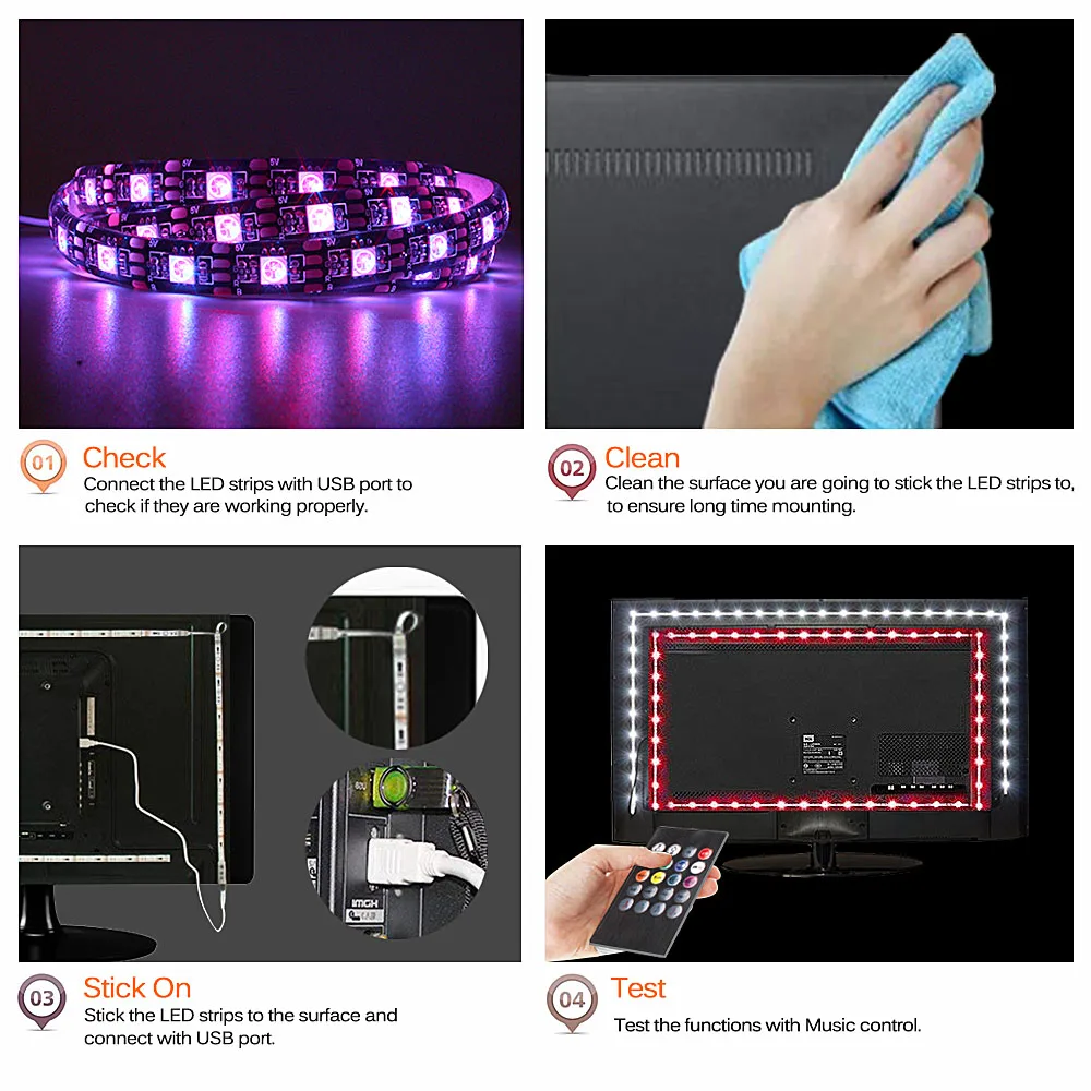 1. Подсветка телевизора, компьютер, автодом, кухня, гостиная, спальня, кабинет, украшение автомобиля 2. Декоративные строительные линии, ландшафтное освещение, тематические развлечения, 3. Праздничная скульптура светильник, декоративная фигура, активные вывески, дисплеи, витрины 4. И бар, диско, улица, тротуар, мост, парк, крыльцо, лестница, перила, потолок. Простая установка: 1. Снимите: Снимите клейкую подложку на ленте. 2. Плотно прижмите ленту в желаемом месте и Подключите USB к USB-порту.