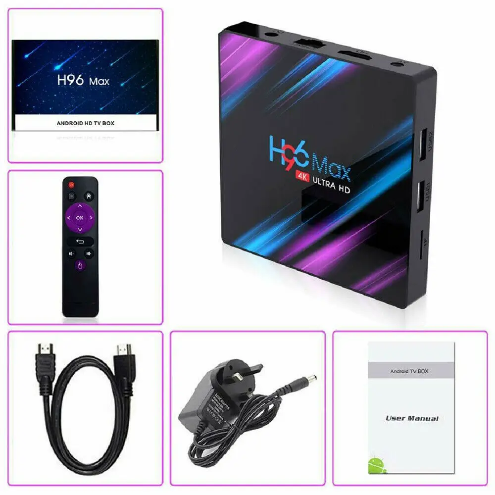 1 * H96 Max Android 9,0 TV Box 1 * Адаптер питания (штепсельная вилка Великобритании) 1 * HDMI кабель 1 * пульт дистанционного управления (не поставляется с батареей)