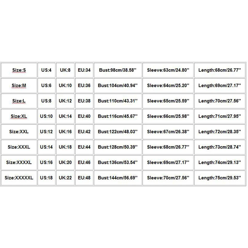 Size US UK EU Bust Sleeve Length S 4 8 34 98cm/38.58'' 63cm/24.80'' 68cm/26.77'' M 6 10 36 104cm/40.94'' 64cm/25.20'' 69cm/27.17'' L 8 12 38 110cm/43.31'' 65cm/25.59'' 70cm/27.56'' XL 10 14 40 116cm/45.67'' 66cm/25.98'' 71cm/27.95'' XXL 12 16 42 122cm/48.03'' 67cm/26.38'' 72cm/28.35'' XXXL 14 18 44 128cm/50.39'' 68cm/26.77'' 73cm/28.74'' XXXXL 16 20 46 136cm/53.54'' 69cm/27.17'' 74cm/29.13'' XXXXXL 18 22 48 144cm/56.69'' 70cm/27.56'' 75cm/29.53''