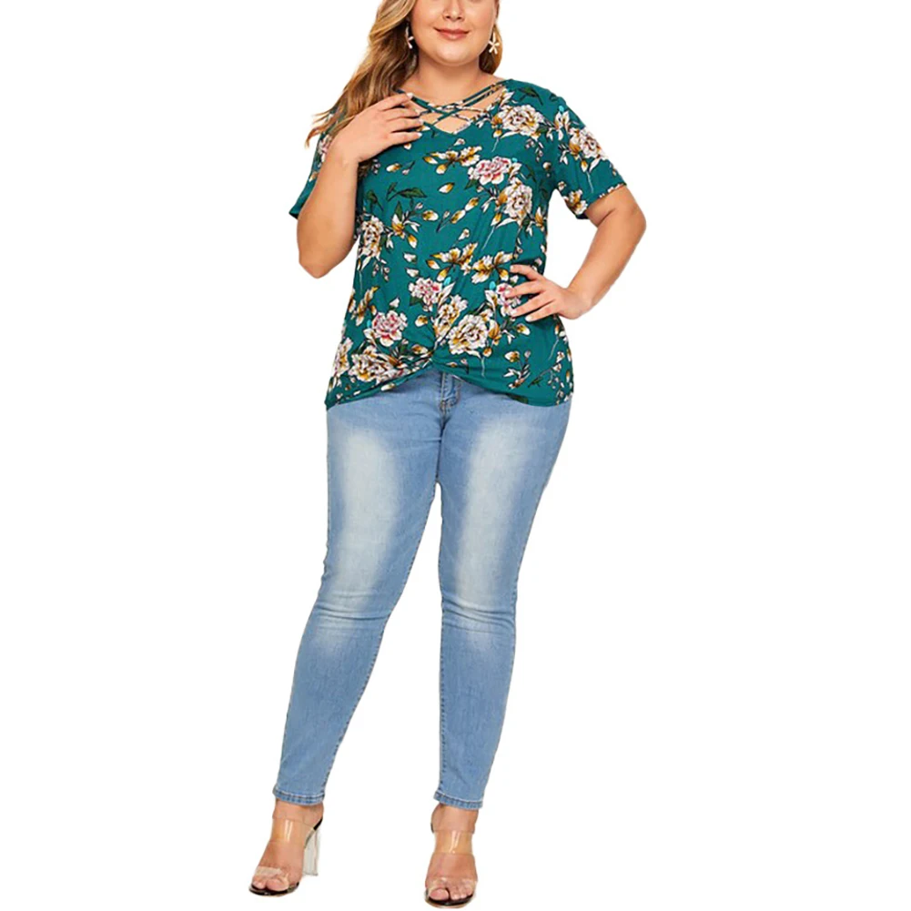 Модная женская Повседневная Блузка с v-образным вырезом и коротким рукавом с цветочным принтом размера плюс