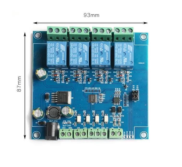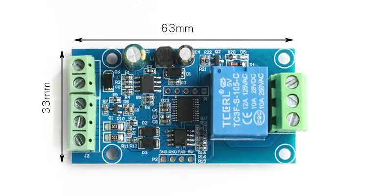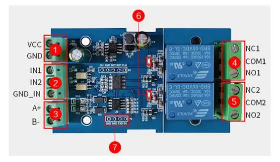 1. VCC, GND: DC7-24V вход питания2. DC3.3-30V оптопара входной сигнал1: канал 1 положительныйN2: канал 2 положительныхGND_IN: общий терминал отрицательный3. A +, B-: Интерфейс связи RS485, A +, B-соответственно подключены к A +, B-внешнего управляющего терминала4. Реле 1 выходной сигнал переключателяNC1; Нормально закрытый терминал, реле замыкается с COM1 перед вытягиванием, и левый плавающий после вытягивания; COM1: общий терминалNO1: обычно открытый терминал, реле приостановлено до закрытия, и коротко до COM1 после закрытия.5. Реле 2 переключатель сигнала выходаNC2: нормально закрытый терминал, коротко до COM2 до закрытия реле и приостановлено после закрытияКом2: открытый конец;NO2: обычно открытый терминал, реле приостановлено до закрытия, и коротко до COM2 после закрытия.6. Индикатор реле светильник: светильник включается, когда реле закрыто7. GND.RXD, TXD: TTL уровень коммуникационная плата интерфейса UART, GND, RXD, TXD соответственно подключены к GND, TXD, RXD внешнего управляющего терминала