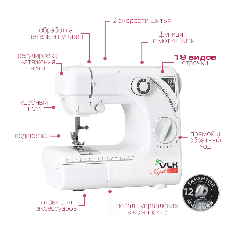Приобретая швейную машину, Вы сможете не только ремонтировать одежду, но и без труда сшить любую необходимую вещь. Швейная машина VLK Napoli 2400 станет Вашим незаменимым помощником, превратив шитье в творческий и увлекательный процесс.