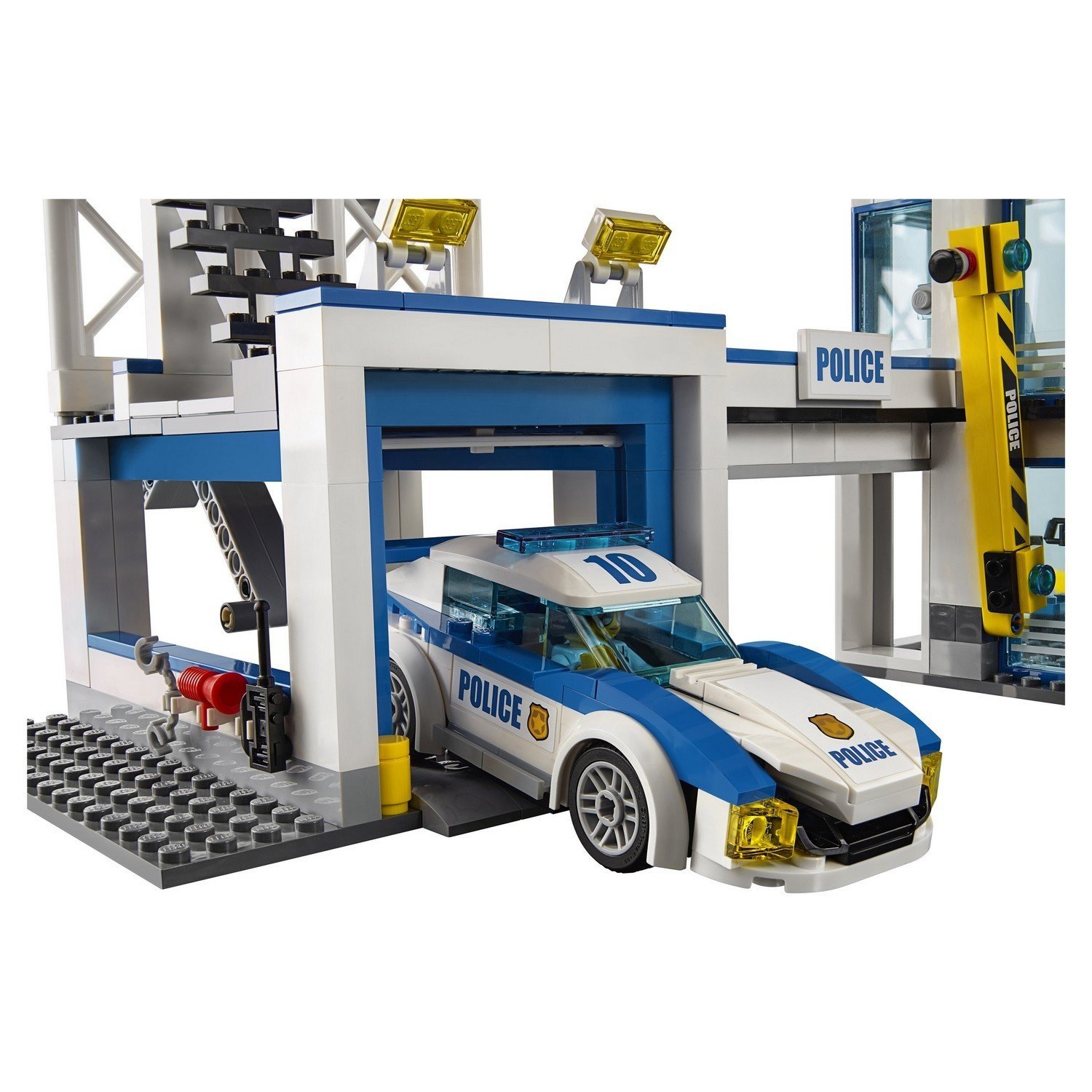 Из деталей набора собирается трехэтажное здание участка, на крыше которого размещается вертолетная площадка. С правой стороны к основному корпусу примыкают камеры для содержания заключенных, выстроенные в два яруса. С левой стороны – гараж на одну полицейскую машину, над которым располагается башня наблюдательного пункта. Помимо самого здания Вы сможете построить несколько моделей транспорта – полицейский вертолет, полицейскую машину, мотоцикл, грузовик преступников с автоподъемником. Минифигурки входящие в комплект набора – заключенный и два его сообщника, четверо полицейских, фигурка полицейской собаки.Особенности и игровой функционал:-множество интересных помещений различного предназначения;-несколько моделей транспорта для сюжетно-ролевых игр;-выламывающиеся решетки камер;-открывающаяся вентиляционная шахта для подрыва стен тюремного блока;-поднимающаяся стрела с подъемником на автомобиле преступников;-функциональная дверь гаража.