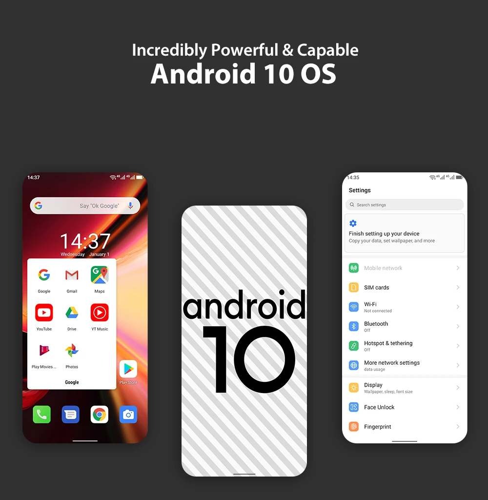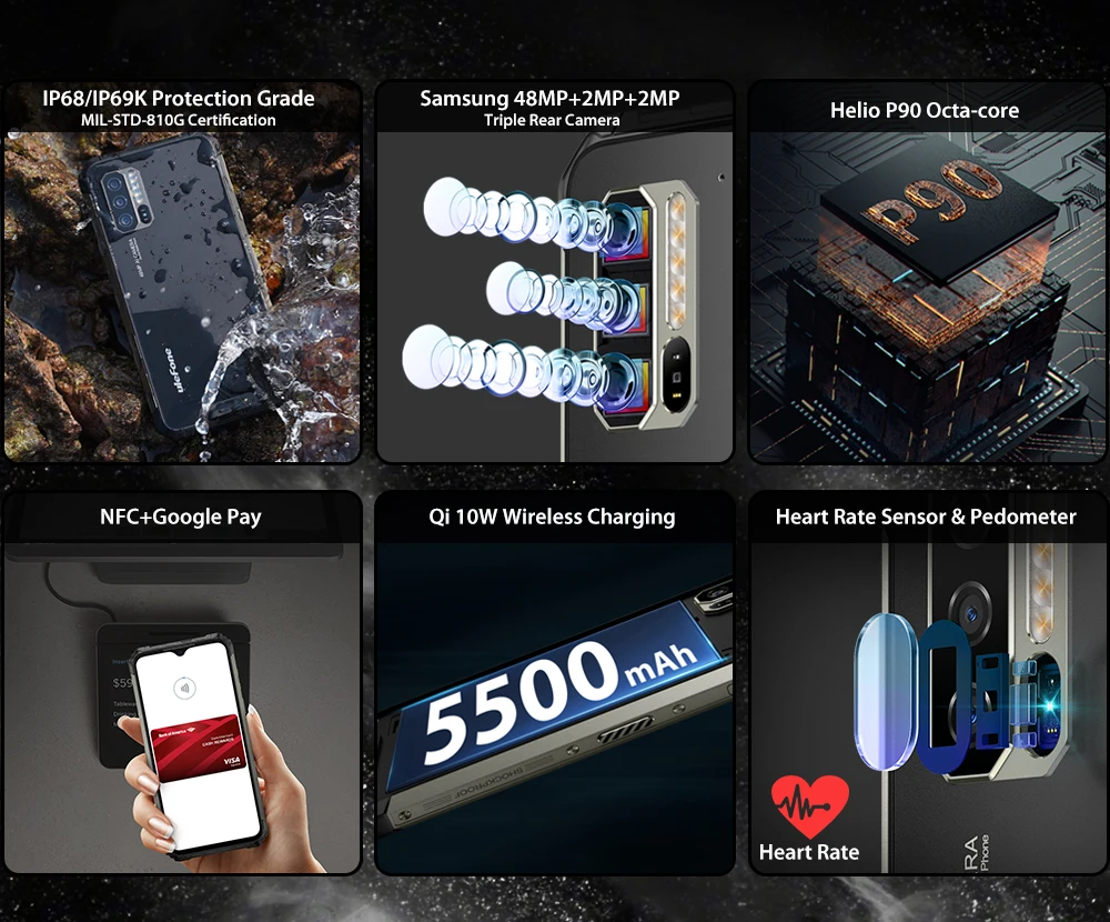 Ulefone Power 7 ОС: сток Android 10 Процессор: Helio P90 (MT6779) 2,2 ГГц Разрешение: IP68 IP69K MIL-STD-810G Дисплей: 6,3 "капля FHD + WIFI: 802,11 a/ac/b/g/n (2,4G + 5G Версия Bluetooth: Bluetooth®5,0 ОЗУ + ПЗУ: 8 ГБ + 128 ГБ Тыловая Камера: 48MP + 2MP + 2MP Батарея: 5500 мАч Особенности: датчик ускорения, g-сенсор, p-сенсор, l-сенсор, e-компас, гироскоп, NFC, бароцептор, датчик сердечного ритма, кулонметр, GPS + ГЛОНАСС + BEIDOU + Galileo
