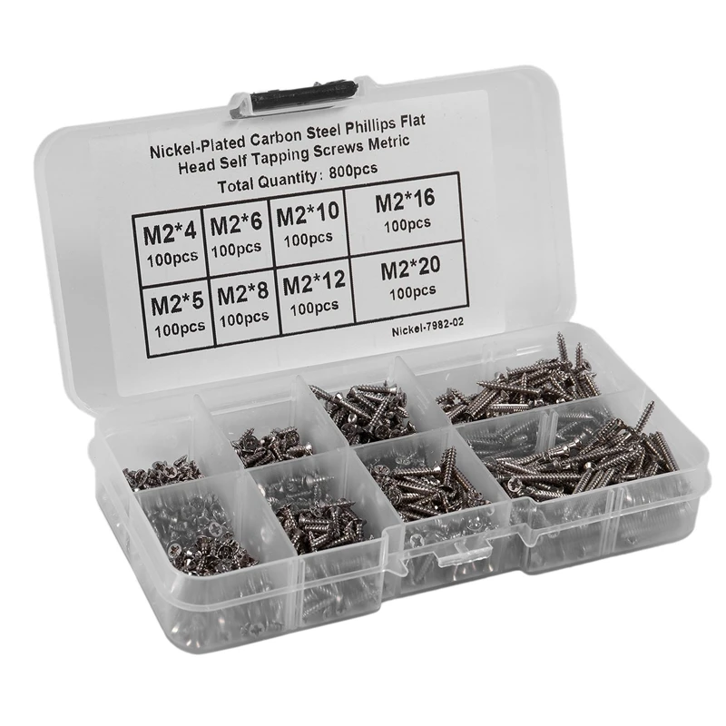 Вы получите 800 штук винтов M2, упакованных пластиковой коробкой-органайзером с решетками, винты помещаются в соответствии с различной классификацией.