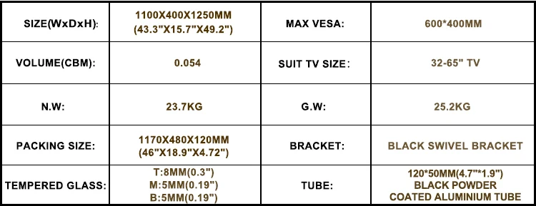 · Хорошая поддержка веса-закаленное защитное стекло будет держать прочную базу с толщиной 8/5/5 мм, а вес поддержки 40/25/25 кг. И 50 кг грузоподъемность крепления для поддержки телевизора.