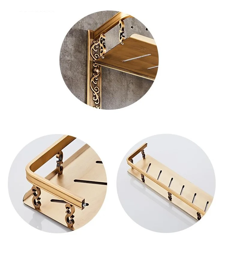 Количество ярусов: двойное Стиль установки: Вставка болта Тип: полки для ванной комнаты Материал: алюминий Материал полки: алюминий Отделка поверхности держателя: бронза