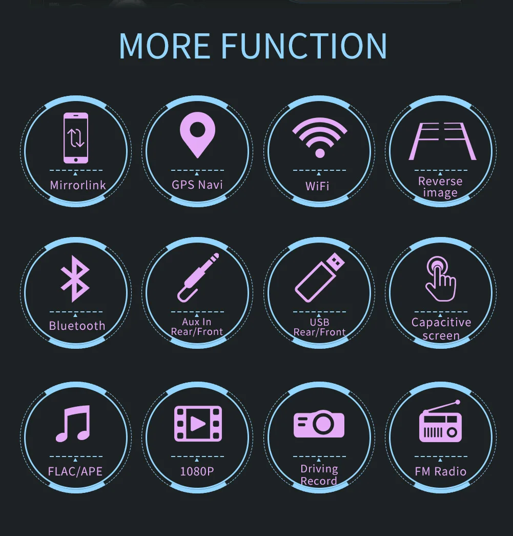 1. Радио (FM) 2. Чтение u-диска (аудио/видео/картинка) 3. Функция AUX 4. Функция Bluetooth 5. Аудиовыход RCA может быть подключен к сабвуферу 6. Функция заднего вида (опционально камера) 7. Видео вход 8. Оригинальная функция обучения рулевого колеса автомобиля 9. Android рекордер может быть установлен 10. WIFI Интернет 11. Gps-навигация 12. Мобильный телефон, подключение (Android/Apple) 13. Приложение может быть установлено 14. Дисплей складывается