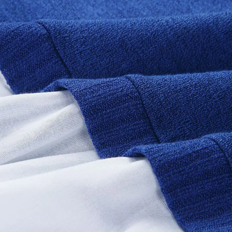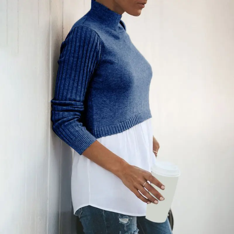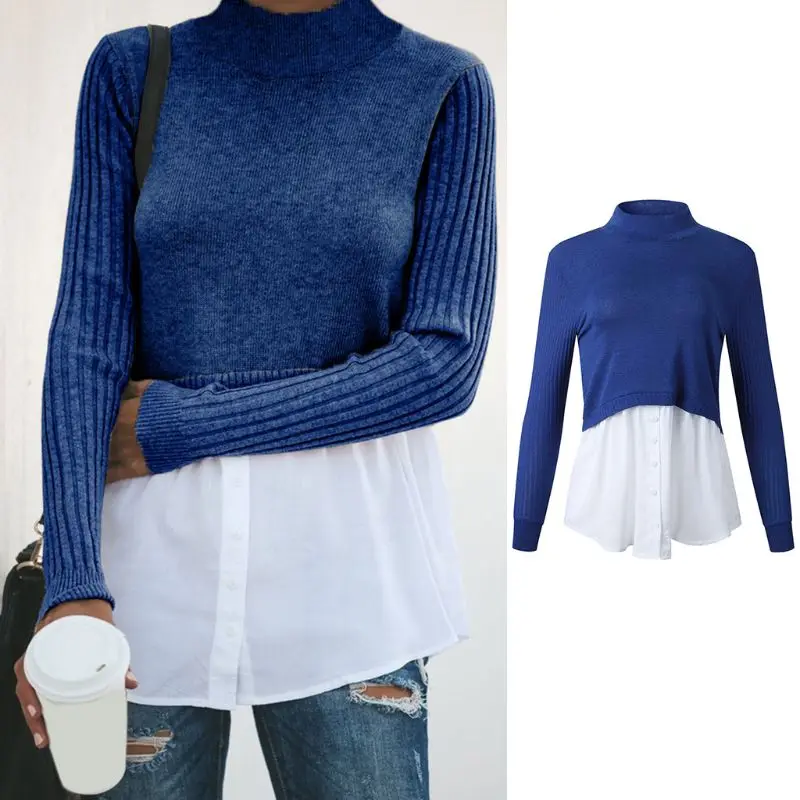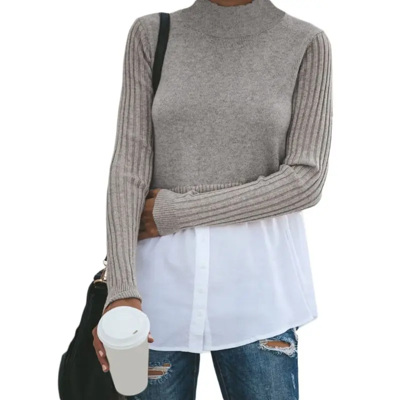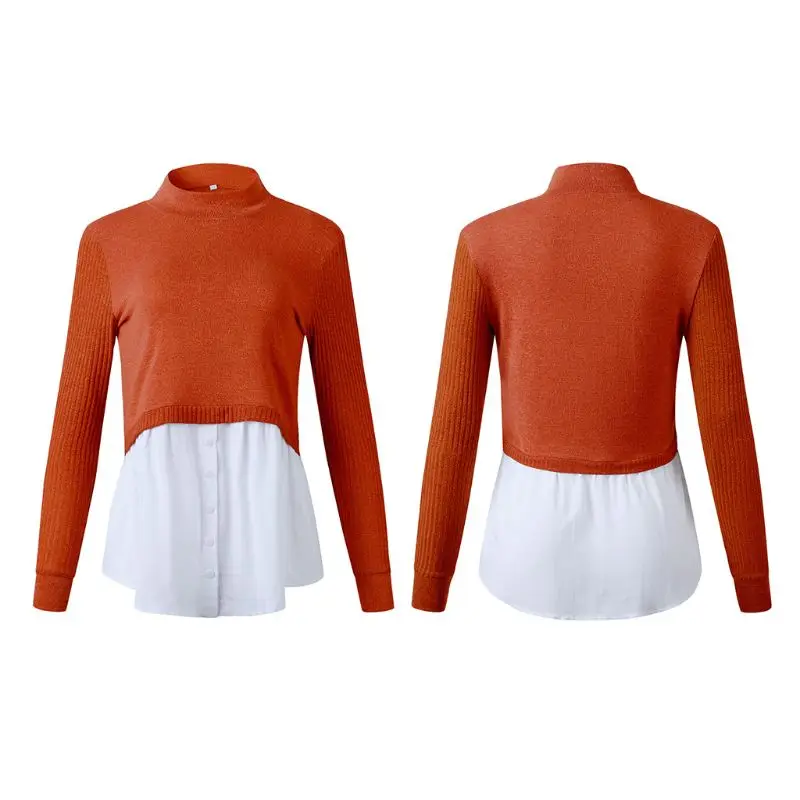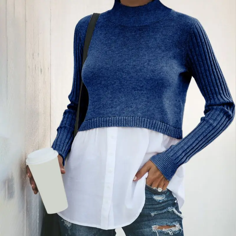 Ребристые трикотажные длинные рукава, половинная высокая горловина, водолазка, Повседневная застежка, пуговица вниз изогнутая белая рубашка подол.