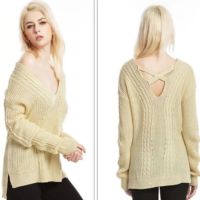 С длинными рукавами, сексуальный v-образный вырез, открытая спина крест-накрест, повседневная застежка, свободный крой, однотонный цвет,