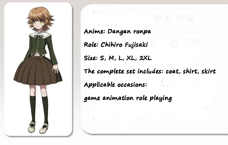 Anime: Dangan ronpa Role: Chihiro Fujisaki Size: S, M, L, XL, 2XL The complete set includes: coat, shirt, skirt Applicable occasions: game animation role playing Hair material: imported high temperature silk, can be dyed Hair color: short brown hair